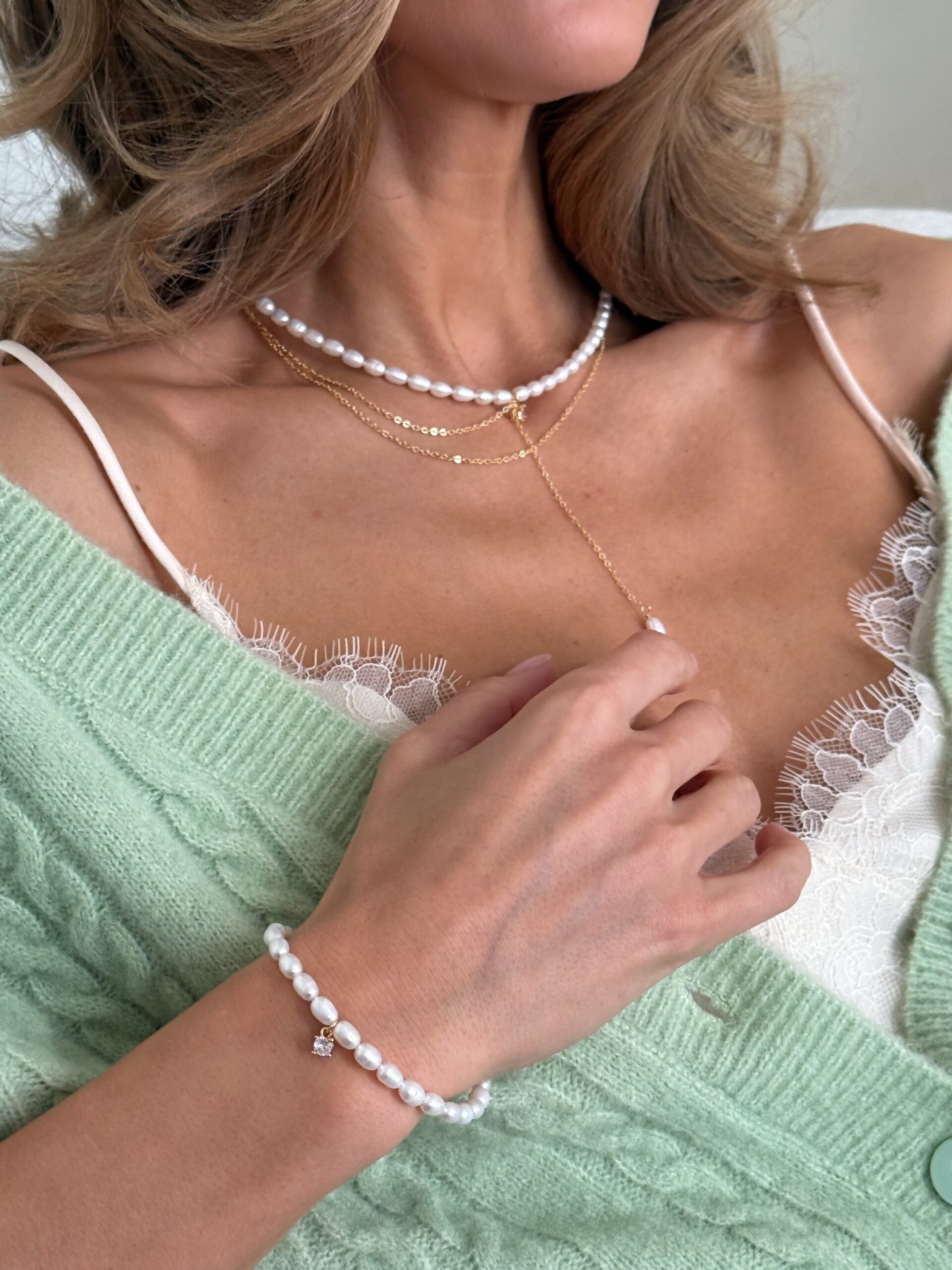 Ніжний перлинний браслет у золотому кольорі — це втілення витонченого мінімалізму. Він м’яко огортає зап’ястя, надаючи образу легкого сяйва та елегантного акценту. Чудово доповнює як святкові, так і повсякденні образи.
