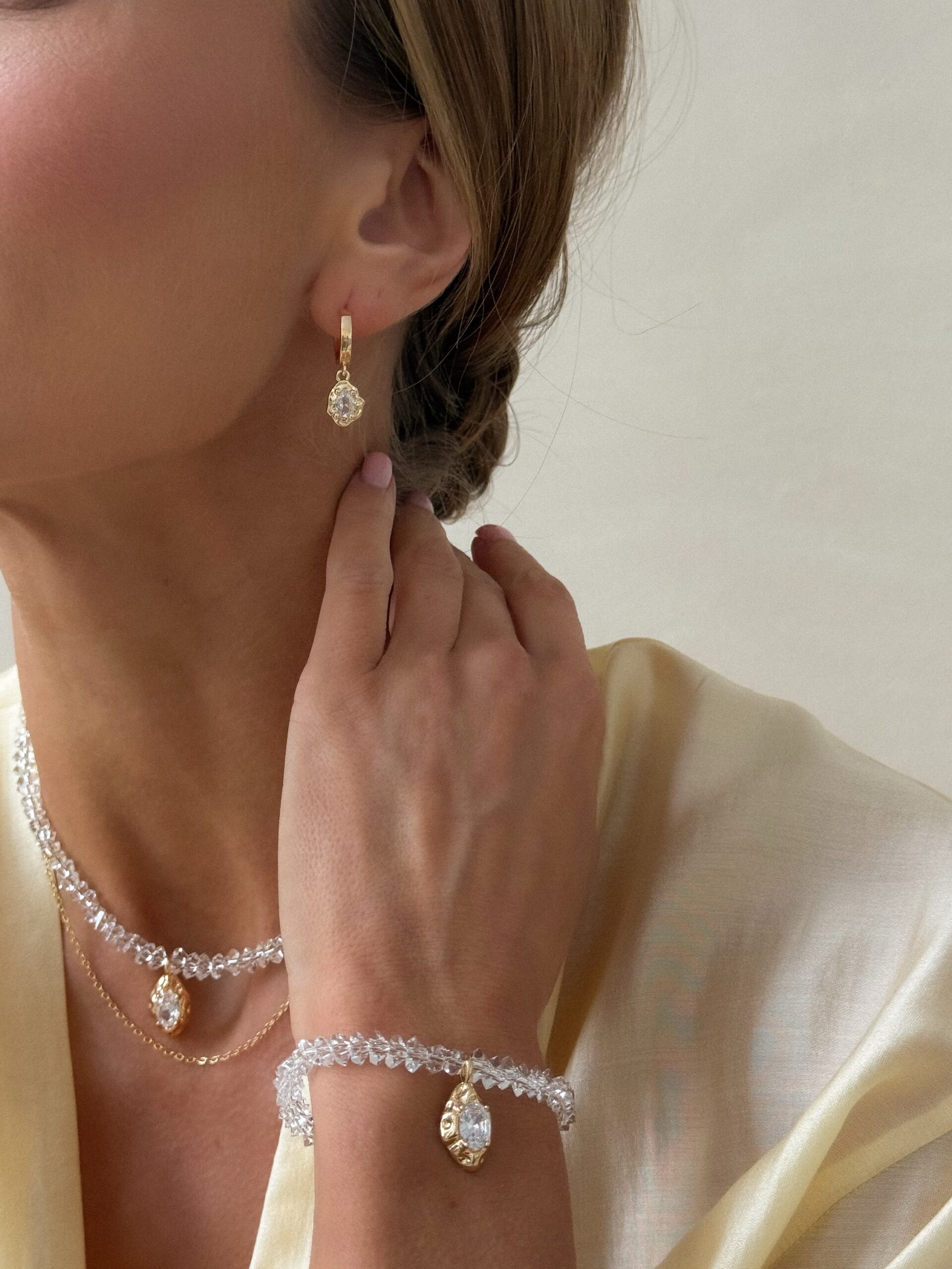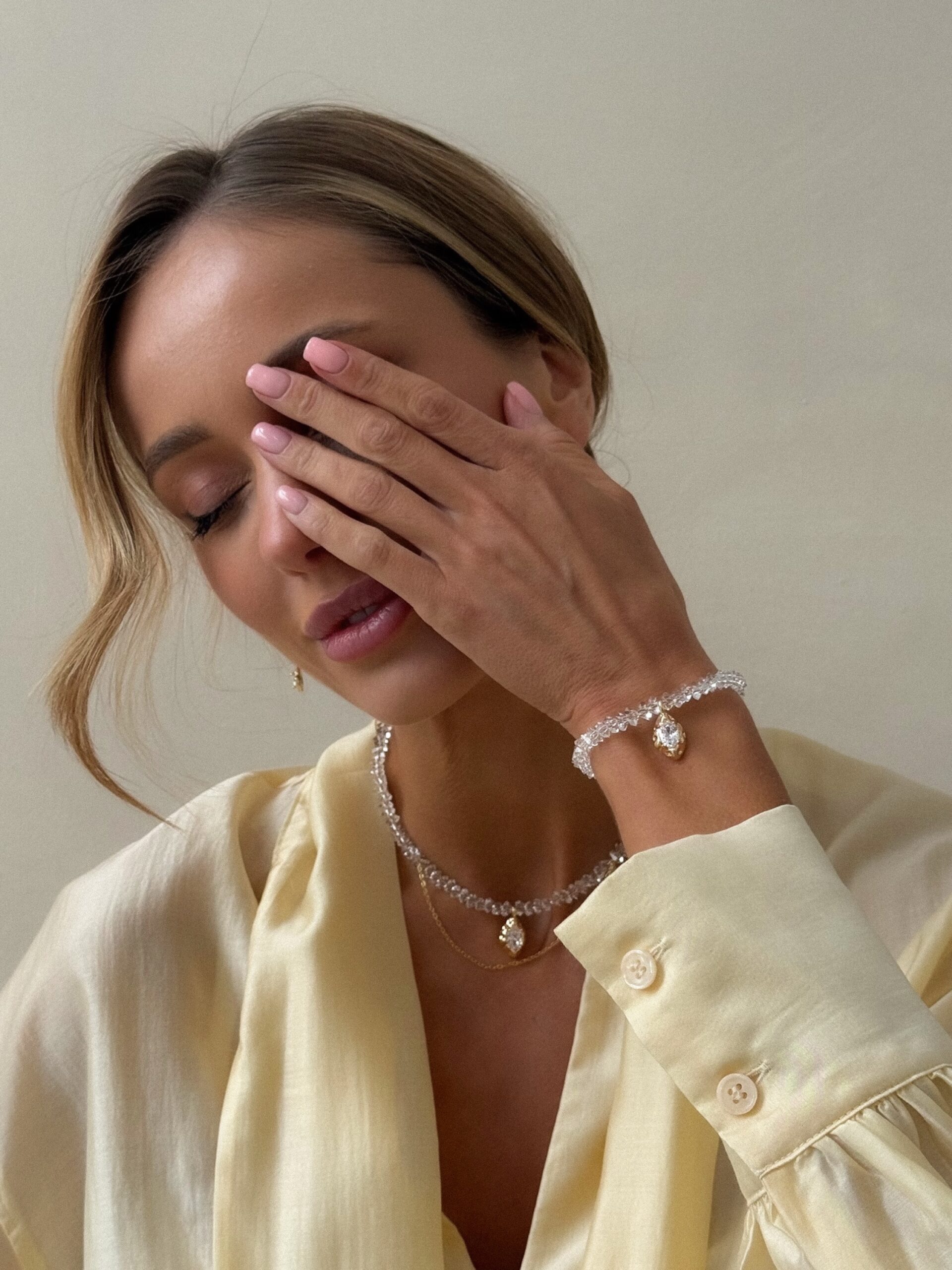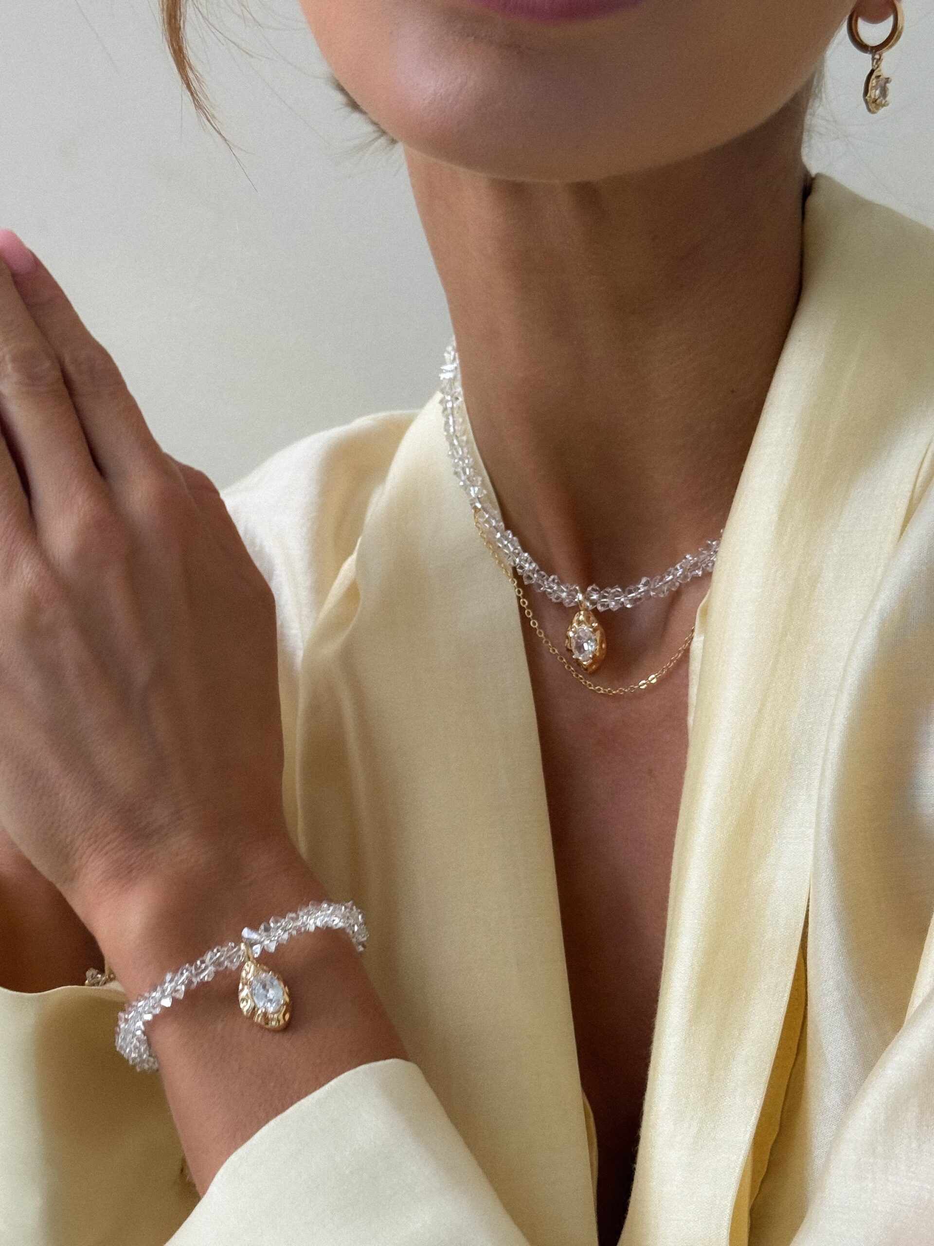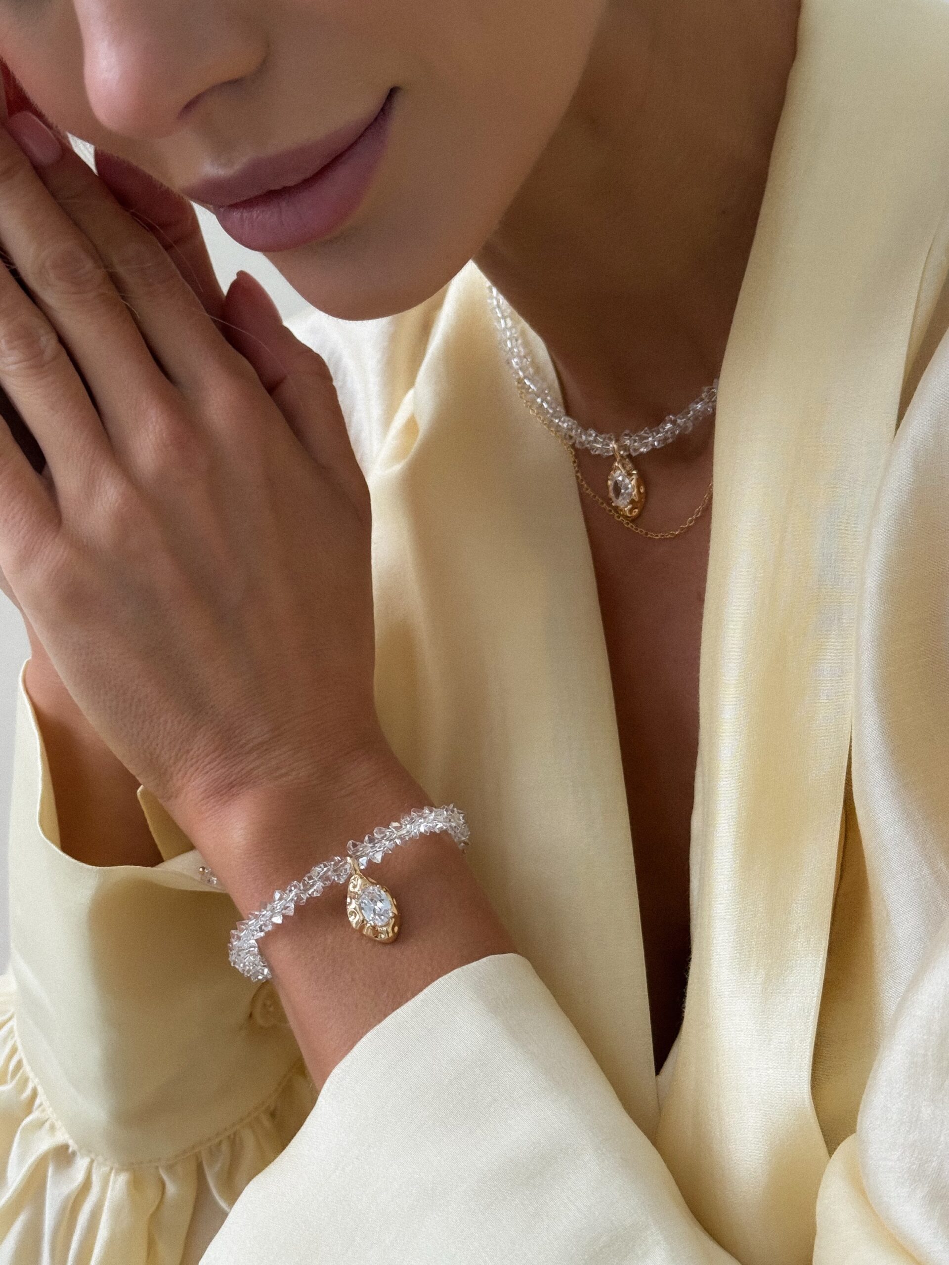 Делікатний браслет з ювелірного кришталю з акцентною підвіскою у золотому обрамленні підкреслює тендітність запʼястя. Лаконічний дизайн гармонійно поєднує блиск кришталю та теплий відтінок золота, створюючи стильний і водночас ніжний аксесуар.