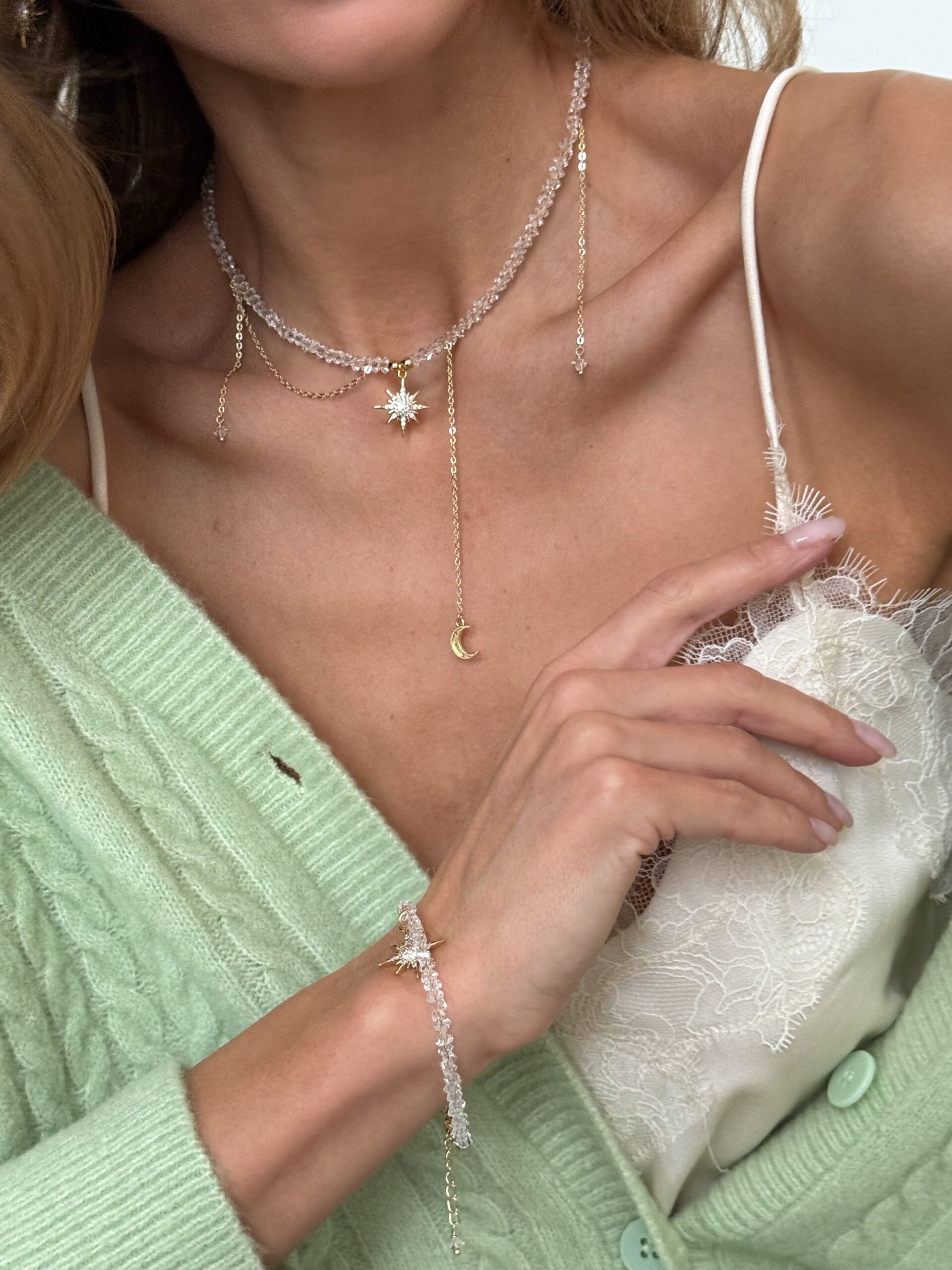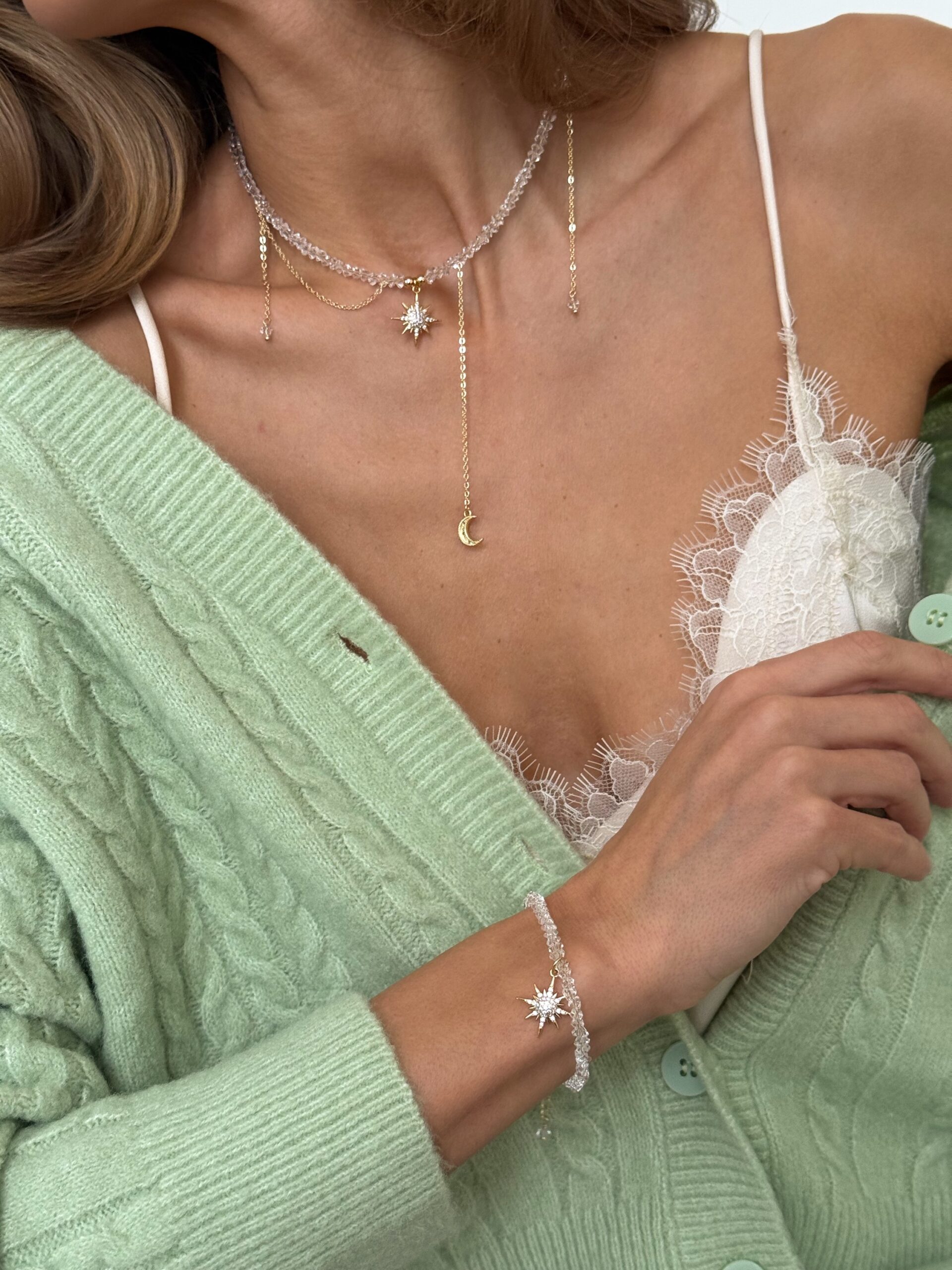 Цей браслет — мов нічне небо, втілене в прикрасі. Прозорий кришталь виблискує з кожним рухом, створюючи відчуття легкості й чистоти, а підвіска у формі золотої зірки, вкрита фіанітами, додає магічного сяйва. Витончене поєднання світла й блиску робить цей браслет ніжним акцентом у будь-якому образі.