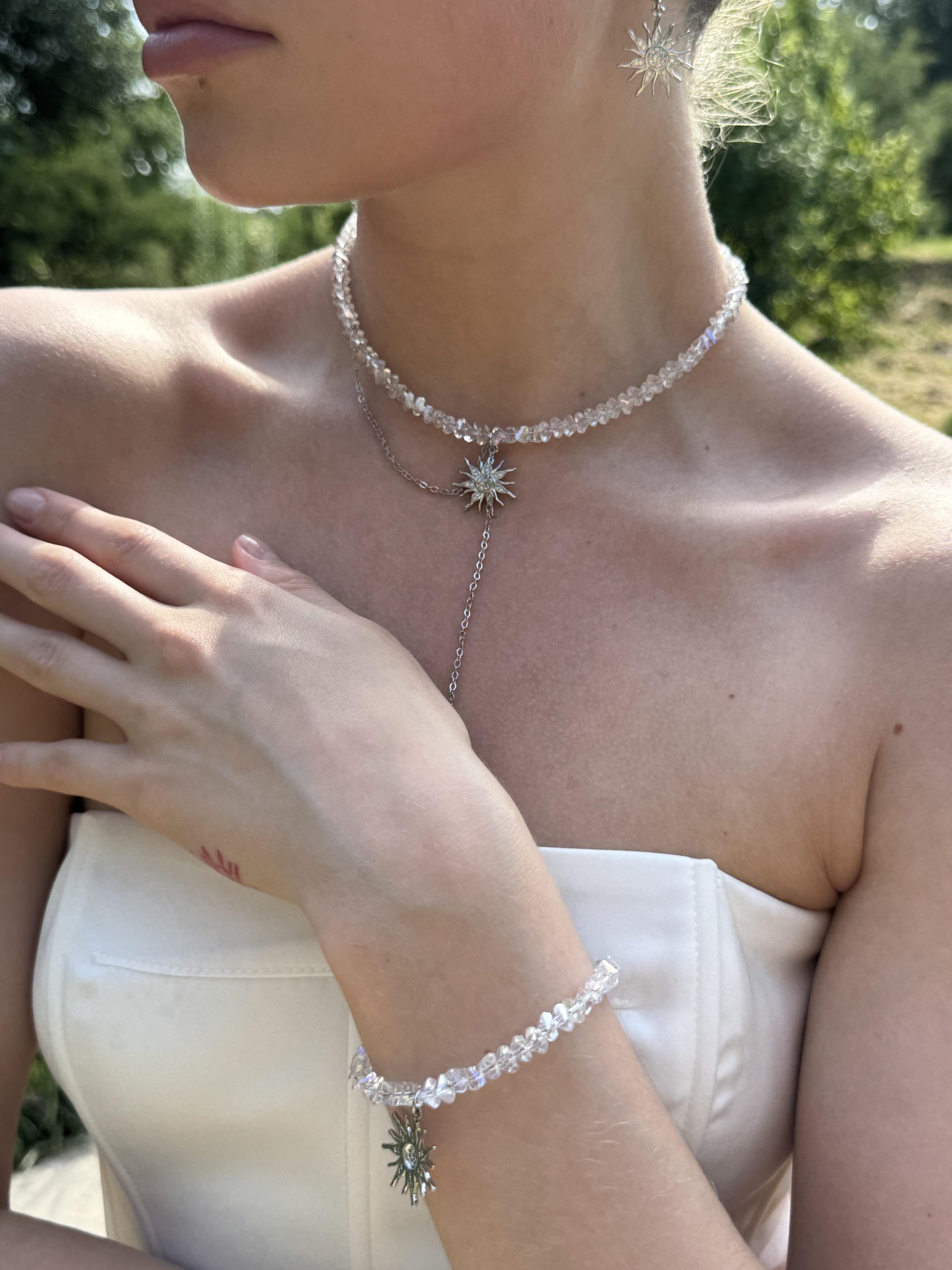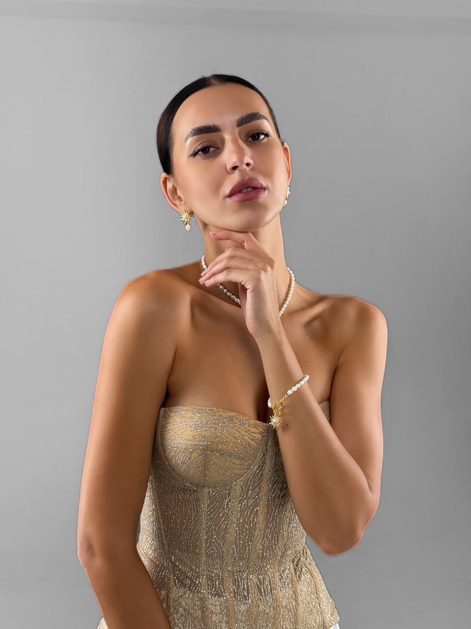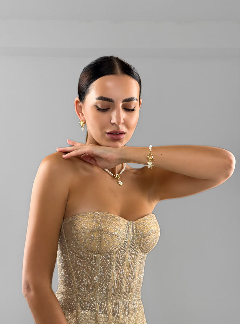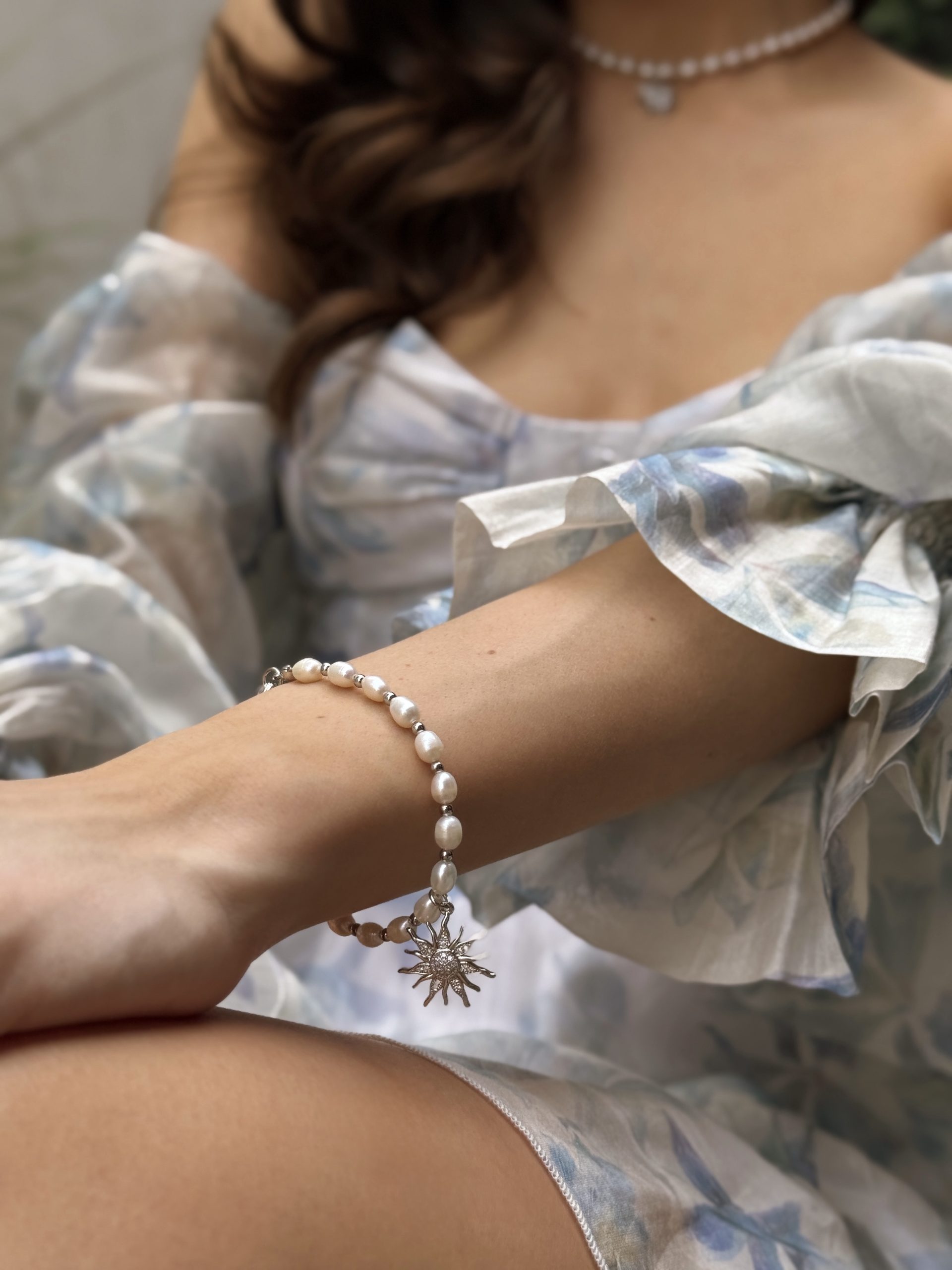 Браслет, що несе тепло. Золоте сонце на тлі ніжних перлів нагадує — світло завжди поруч. Його делікатне сяйво огортає зап’ястя і додає внутрішньої гармонії.