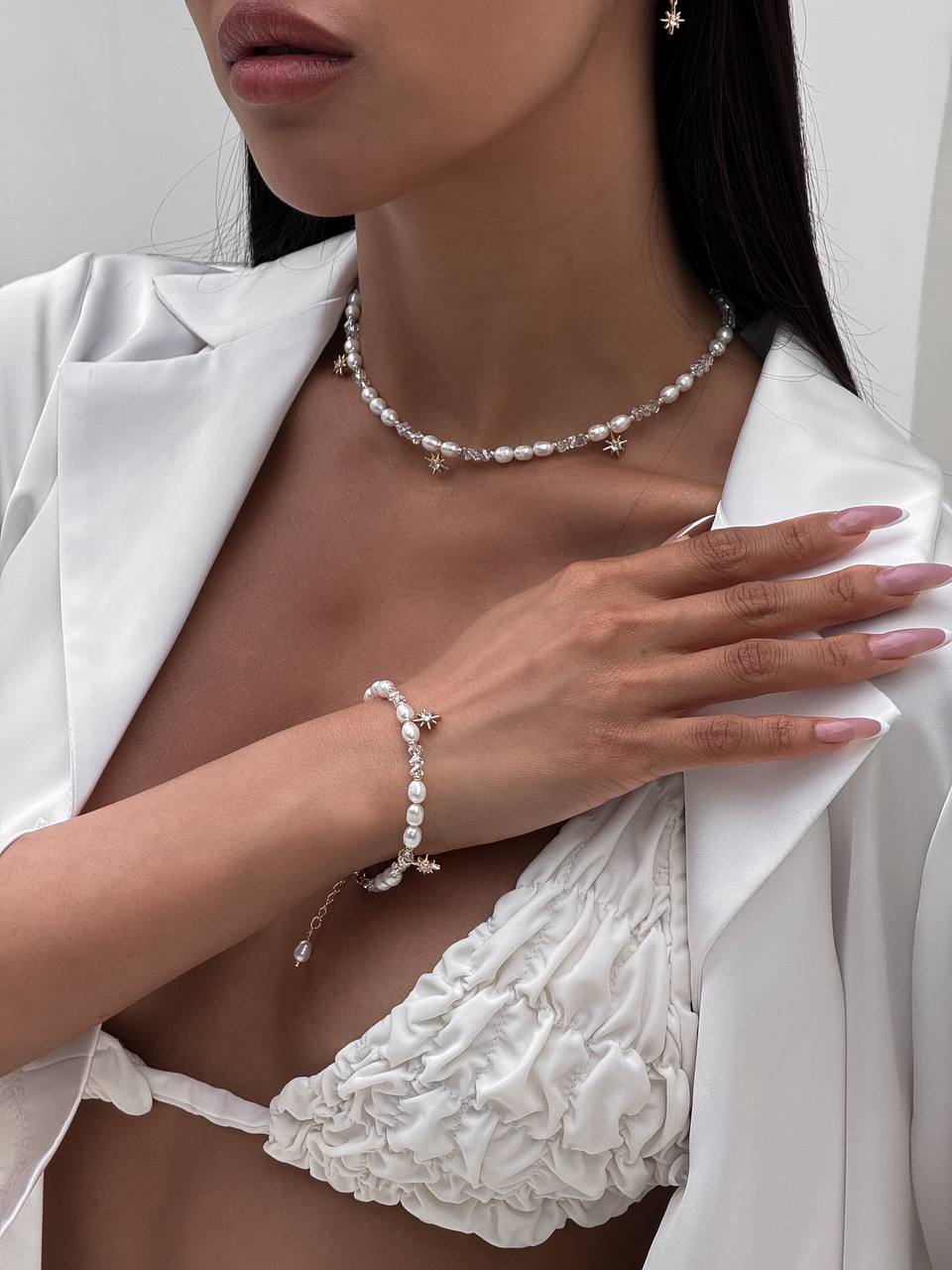 Сяюча каблучка з прозорого кришталю, мов відображення чистого неба, доповнена підвіскою у формі зірки, інкрустованої фіанітами. Зірка м’яко мерехтить при кожному русі, додаючи образу магії та світла.