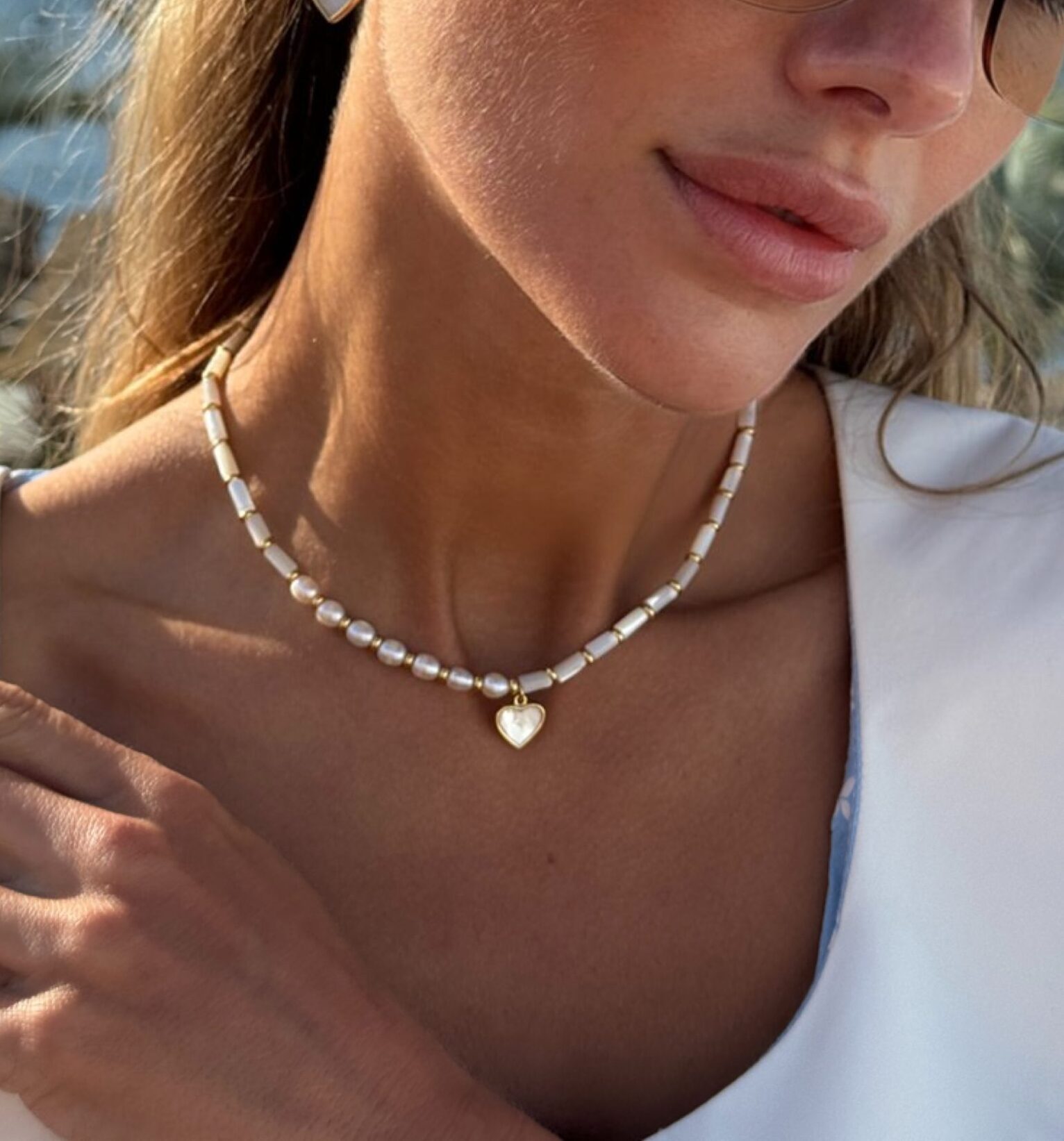 Ніжна каблучка, створена з делікатних перлин, що символізують чистоту та жіночність, доповнена підвіскою у формі серця з перламутру. Легке мерехтіння натурального матеріалу додає прикрасі глибини та світла. Це не просто каблучка — це мить ніжності, що завжди з тобою.
