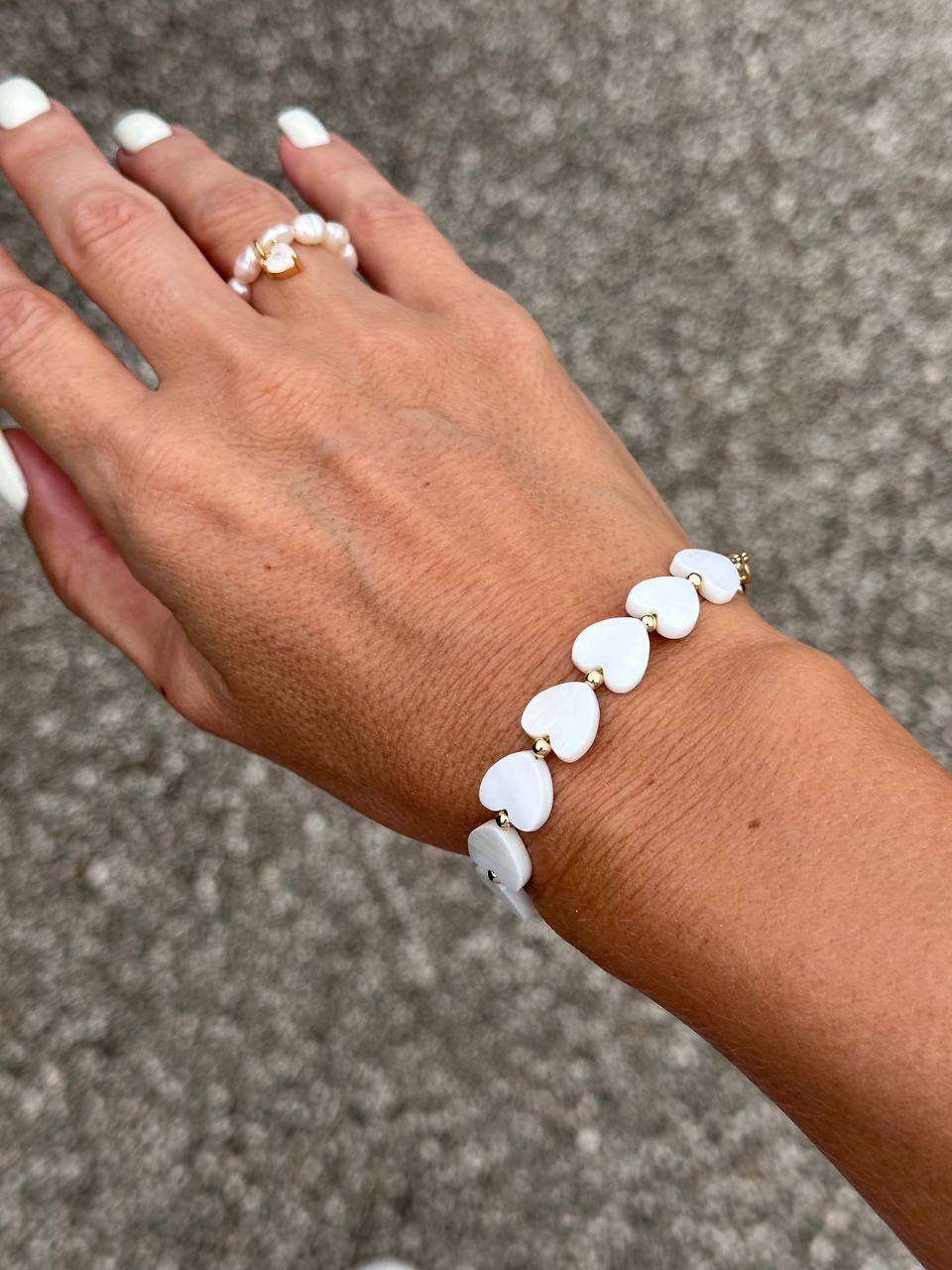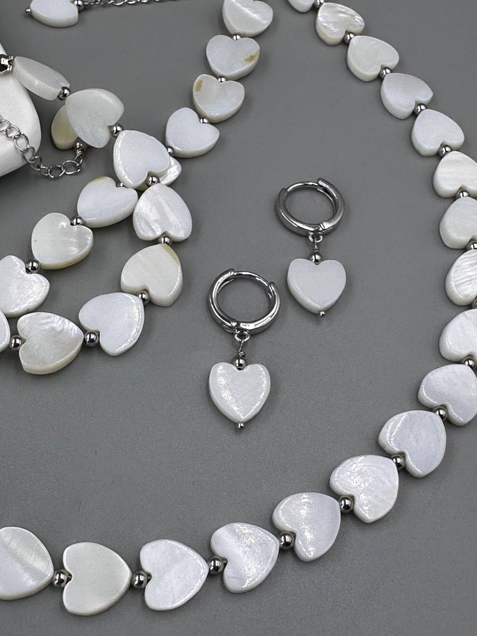 Кольє з перламутрових білих сердечок — втілення чистоти, ніжності й елегантної простоти. Сердечка м’яко виблискують при світлі, мов краплі ранкової роси, огортаючи шию відчуттям тепла та світла. Прикраса, що ніби шепоче про щирість і любов.