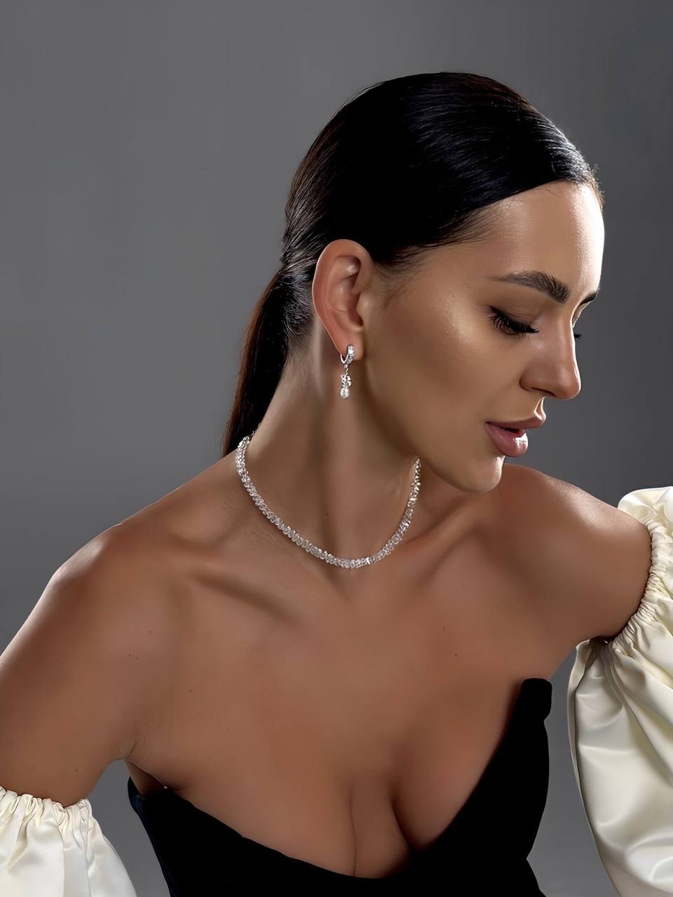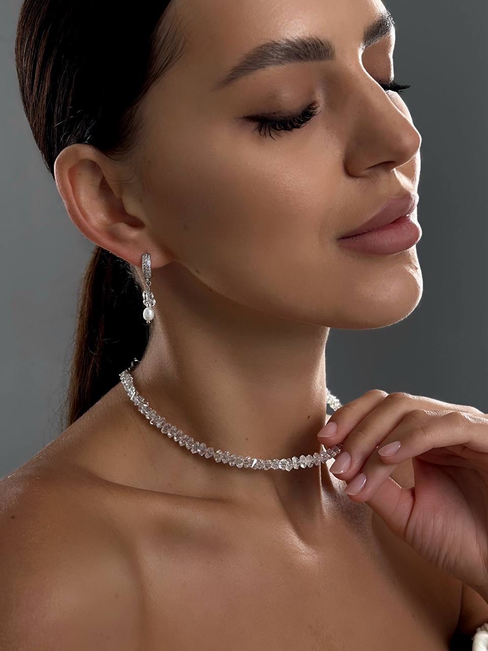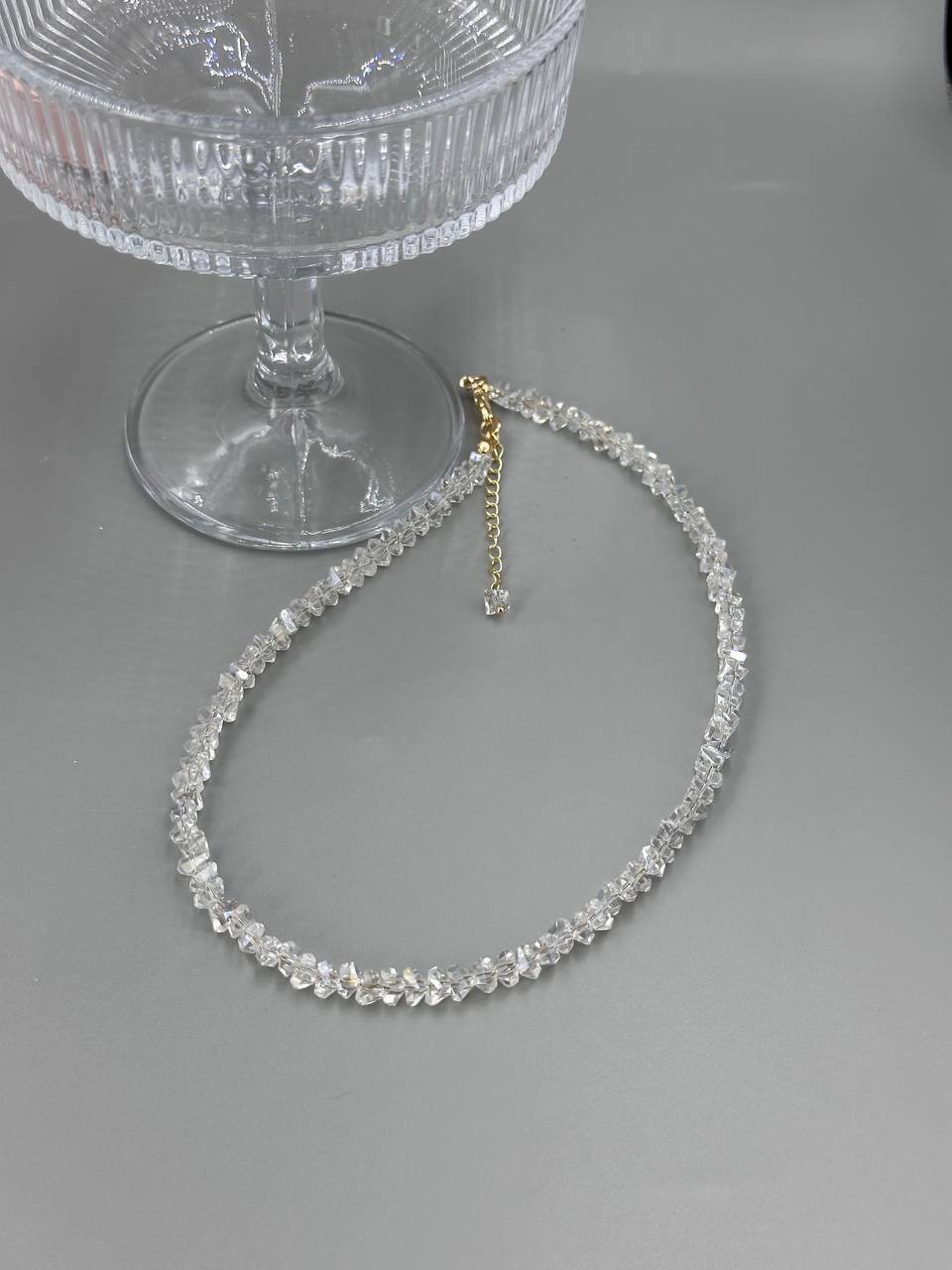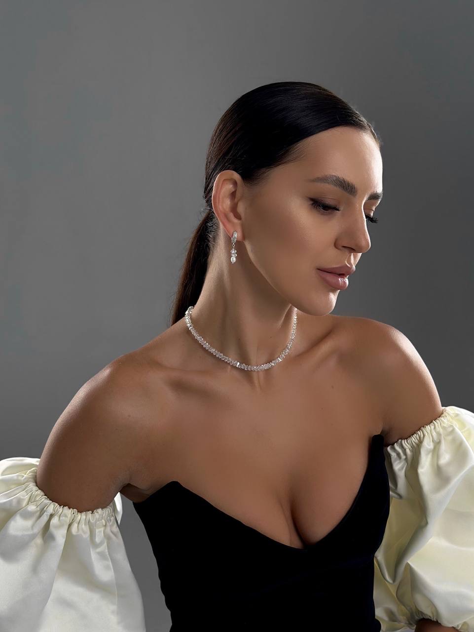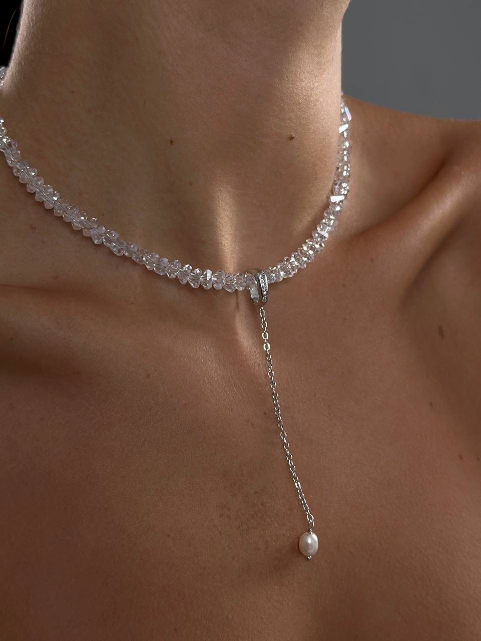 Це вишукане кольє — втілення жіночності та витонченого смаку. Прозорий кришталь створює ніжне мерехтіння, підкреслюючи лінію шиї з елегантною простотою. Ідеальний вибір для вечора або особливої події, де хочеться сяяти не лише усмішкою!