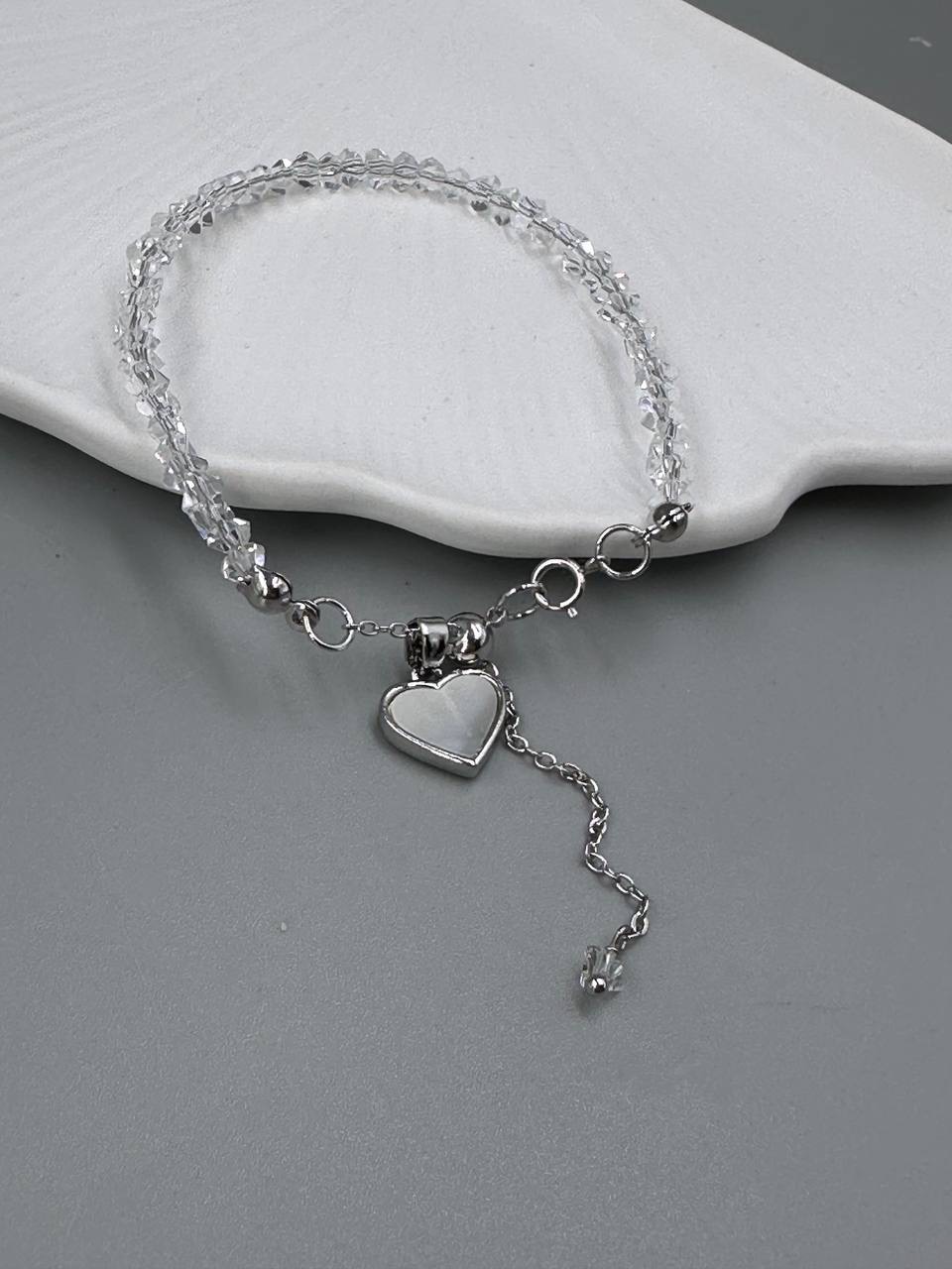 Романтичне кольє з прозорих кришталевих намистин, доповнене підвіскою у формі сріблястого серця з перламутром. Ланцюжок додає нотку витонченості, а символічний мотив серця — чуттєвості.