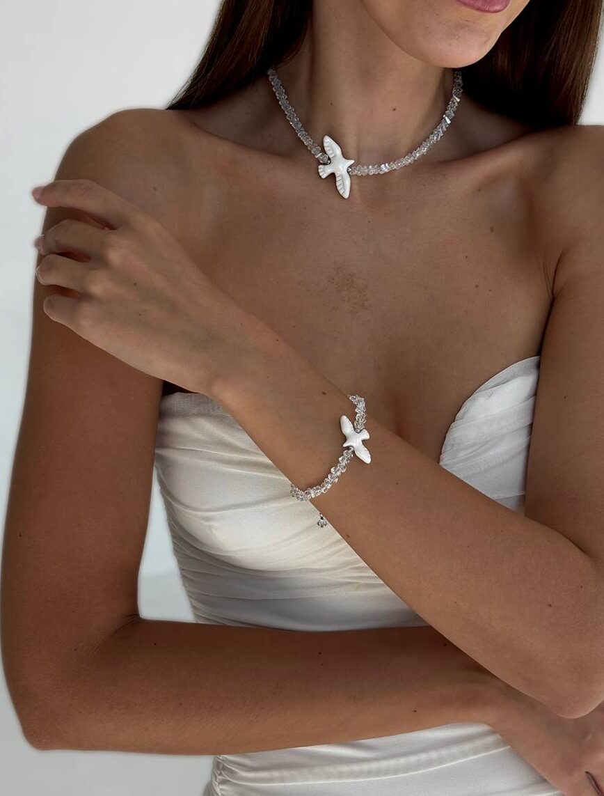 Унікальне кольє поєднує прозорий кришталь з підвіскою у формі білої горлиці. Тонкий ланцюжок створює ефект легкої динаміки, а загальний образ — символ свободи, ніжності та витонченого стилю.