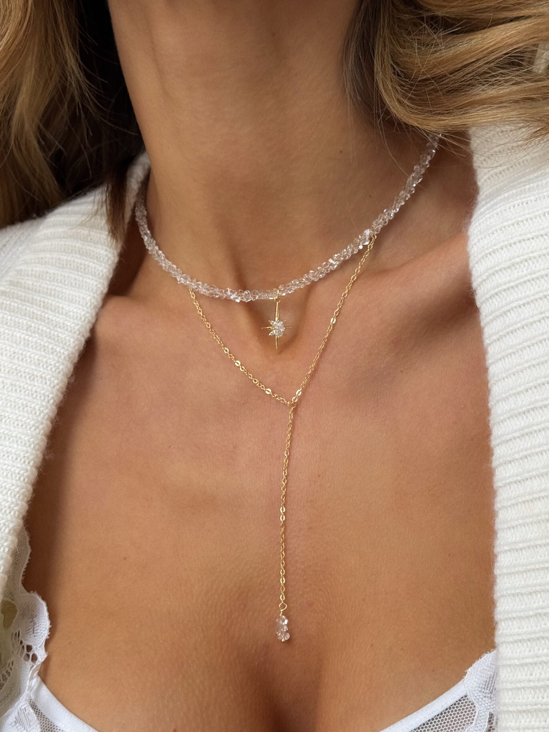 Мерехтливе кришталеве кольє з зірковою підвіскою — ніжне сяйво, що обіймає шию. Елегантна багатошаровість ланцюжків і легка космічна магія в кожному блиску.