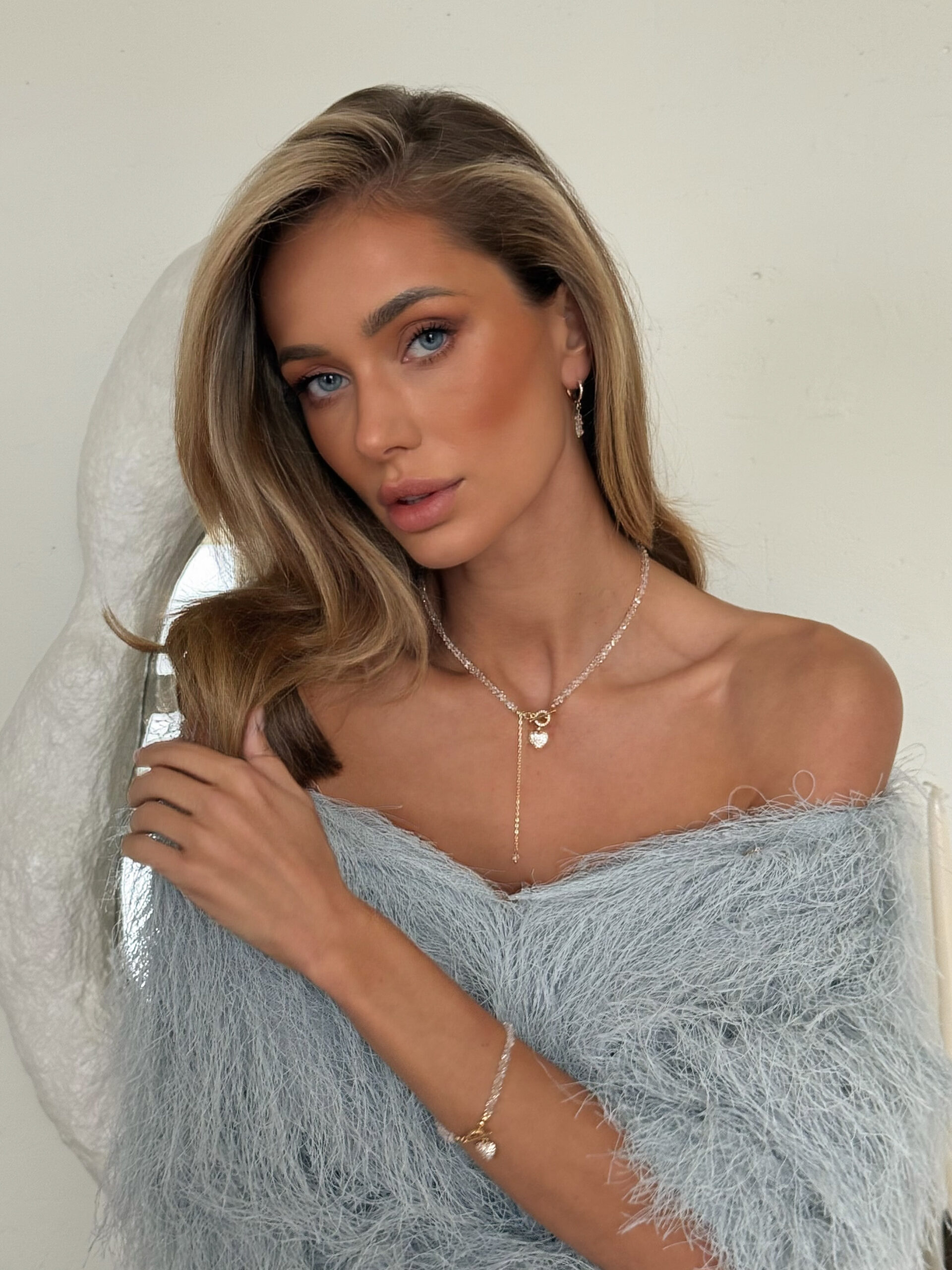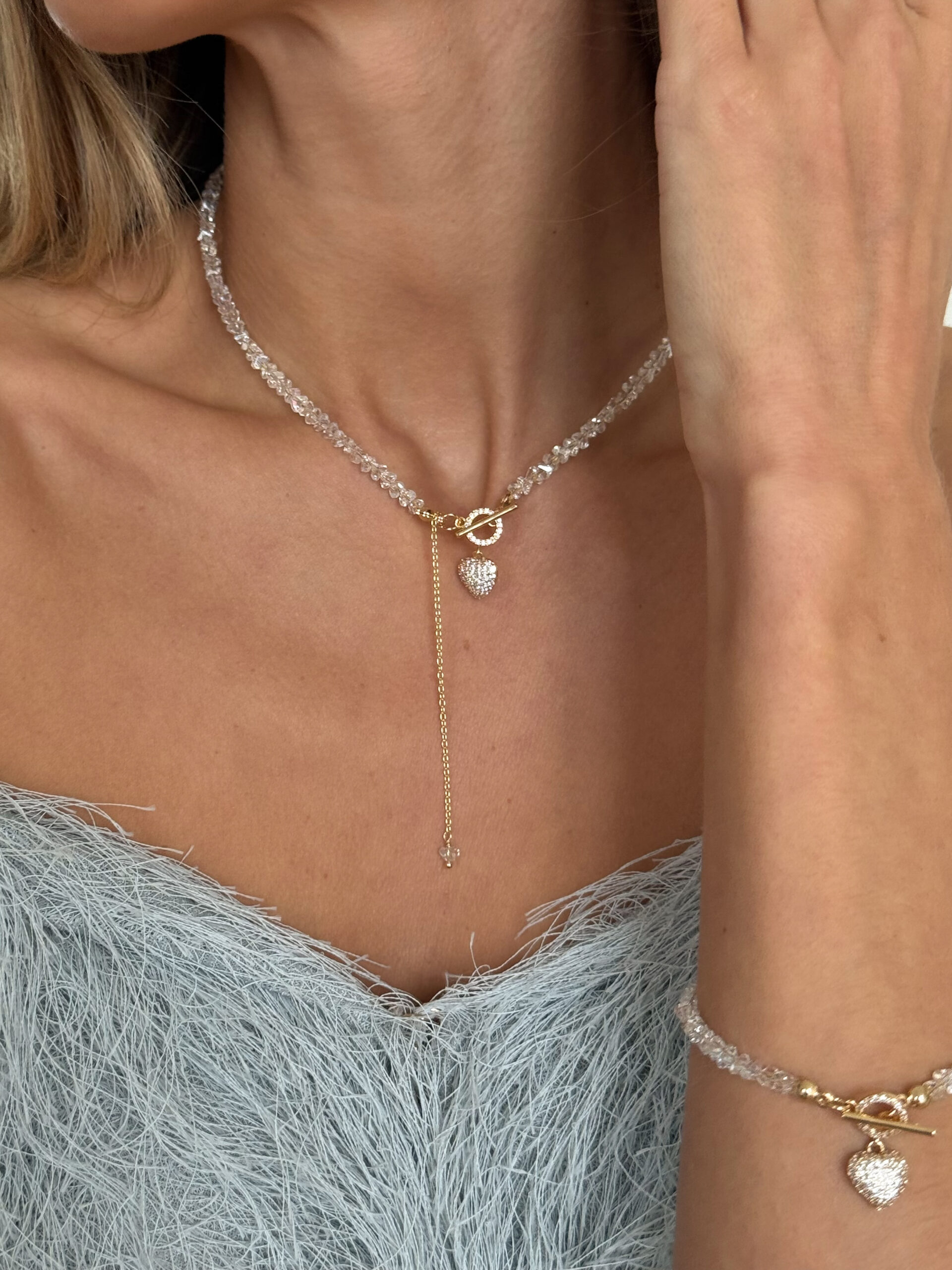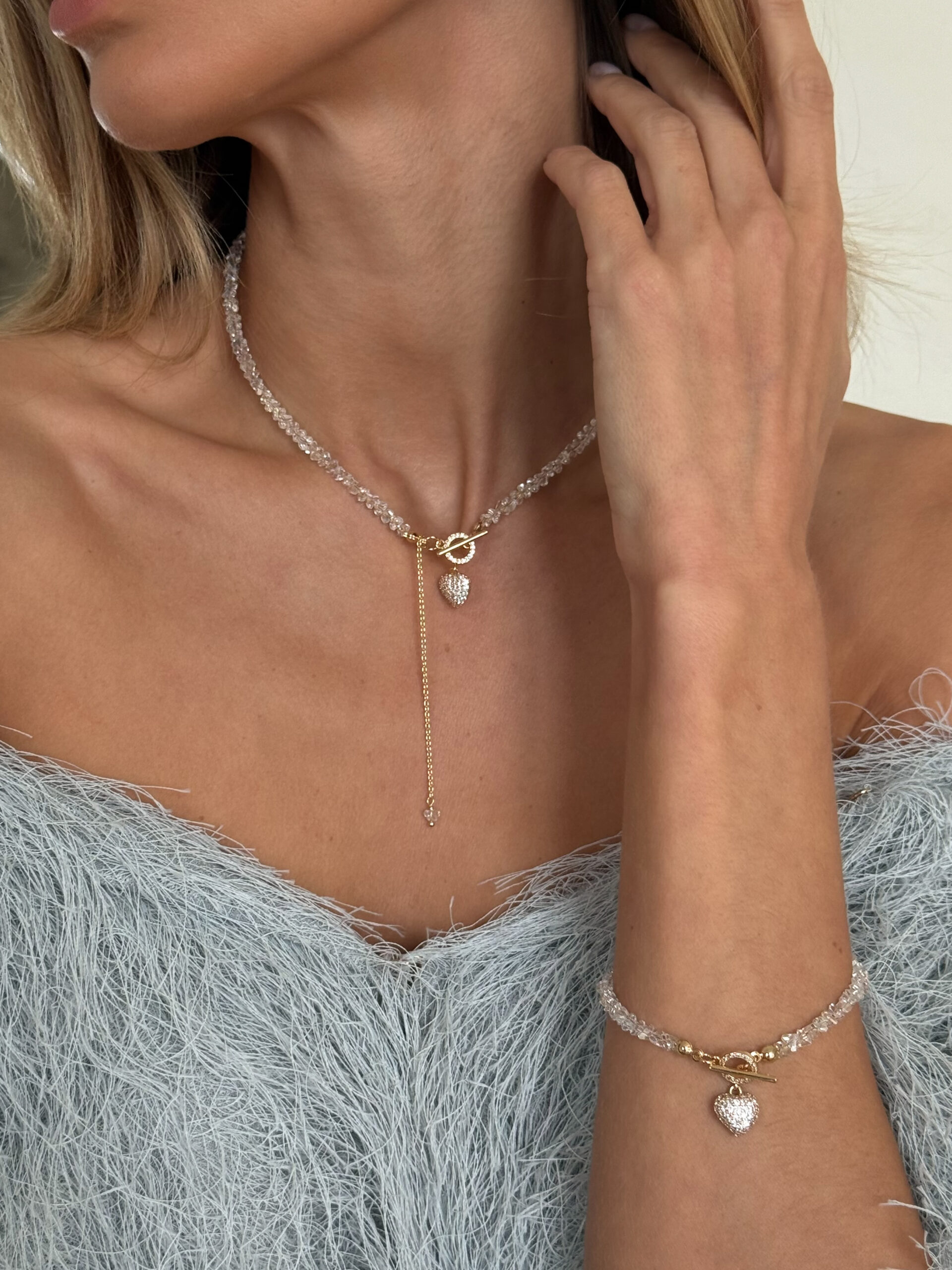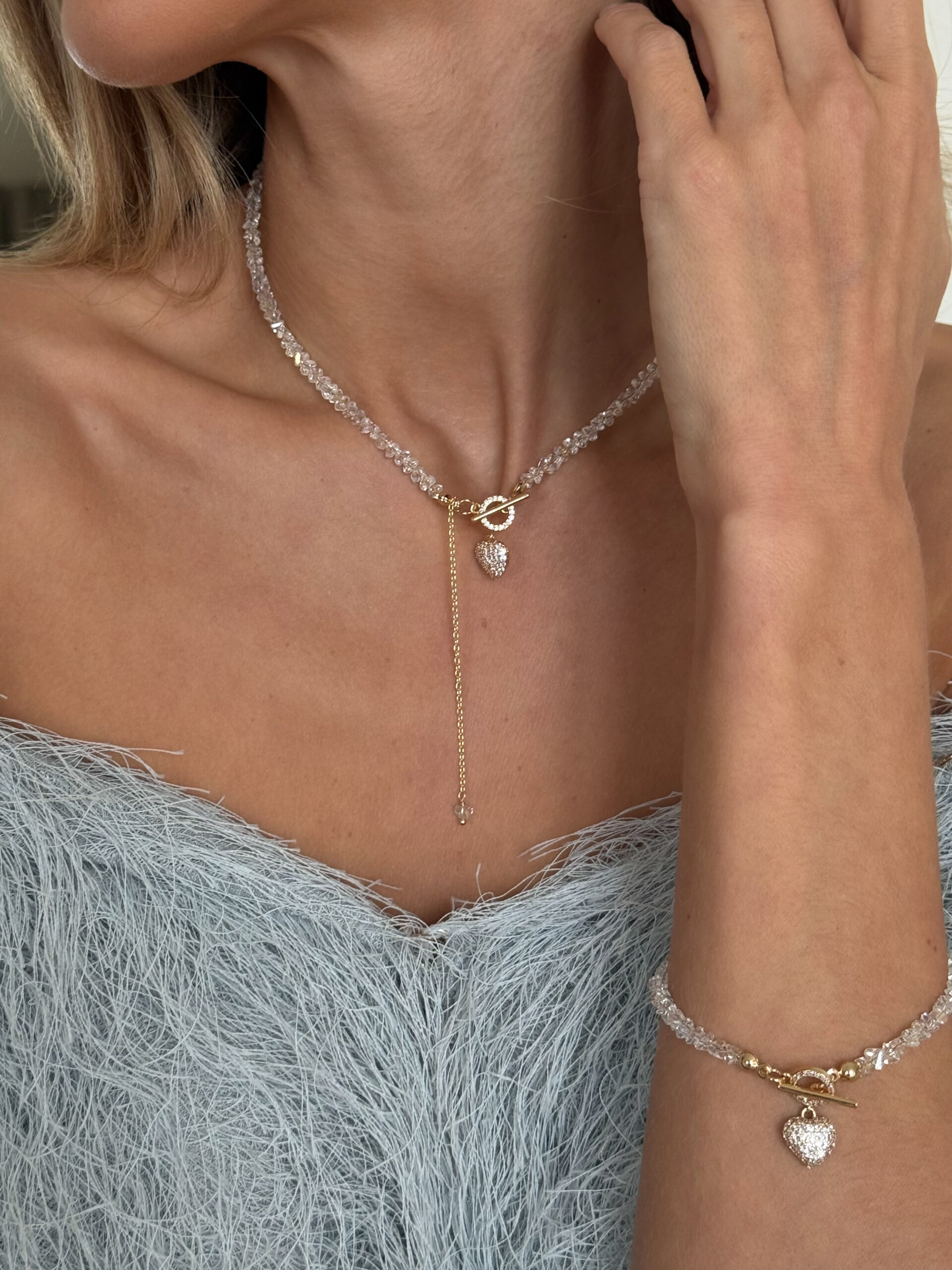 Кольє створене з прозорого кришталю, що ніби ловить світло в кожній грані. У центрі – делікатна позолочена підвіска-серце, яка додає образу тепла та жіночності. Витончений ланцюжок ніжно падає вниз, утворюючи елегантну лінію, що візуально подовжує шию.