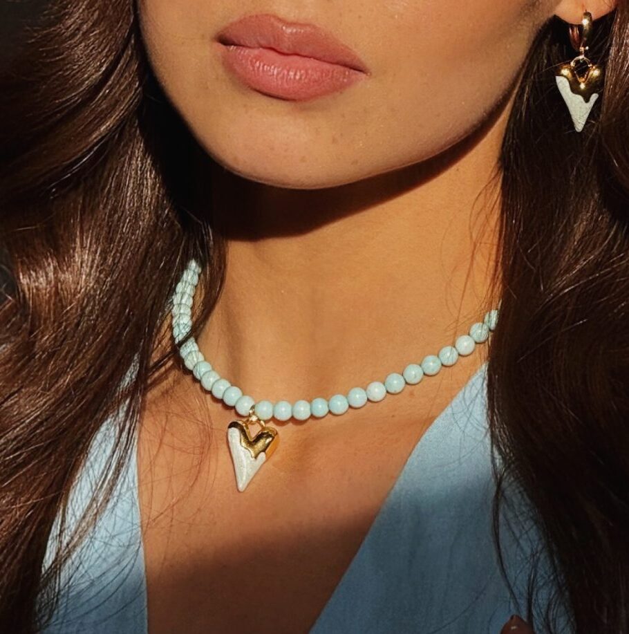 Кольє з блакитного халцедону, завершене рожевим серцем – ніжне поєднання кольорів і форм, яке випромінює гармонію, жіночність і тепло.