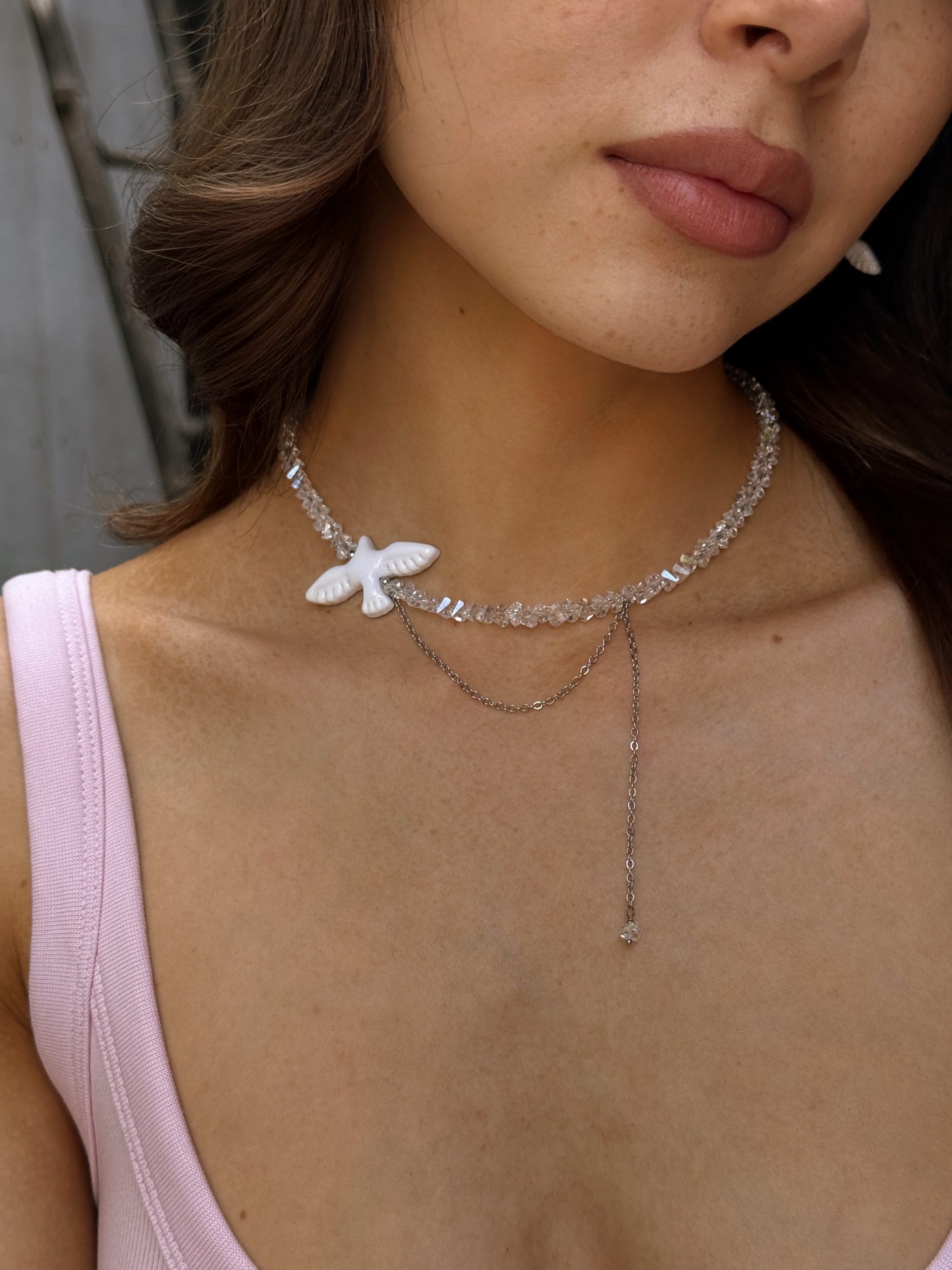 Кольє з ювелірного кришталю з підвісками у формі пташок із полімерної глини — символ свободи та легкості. Ігристе сяйво кришталю гармонійно поєднується з ніжними деталями ручної роботи.