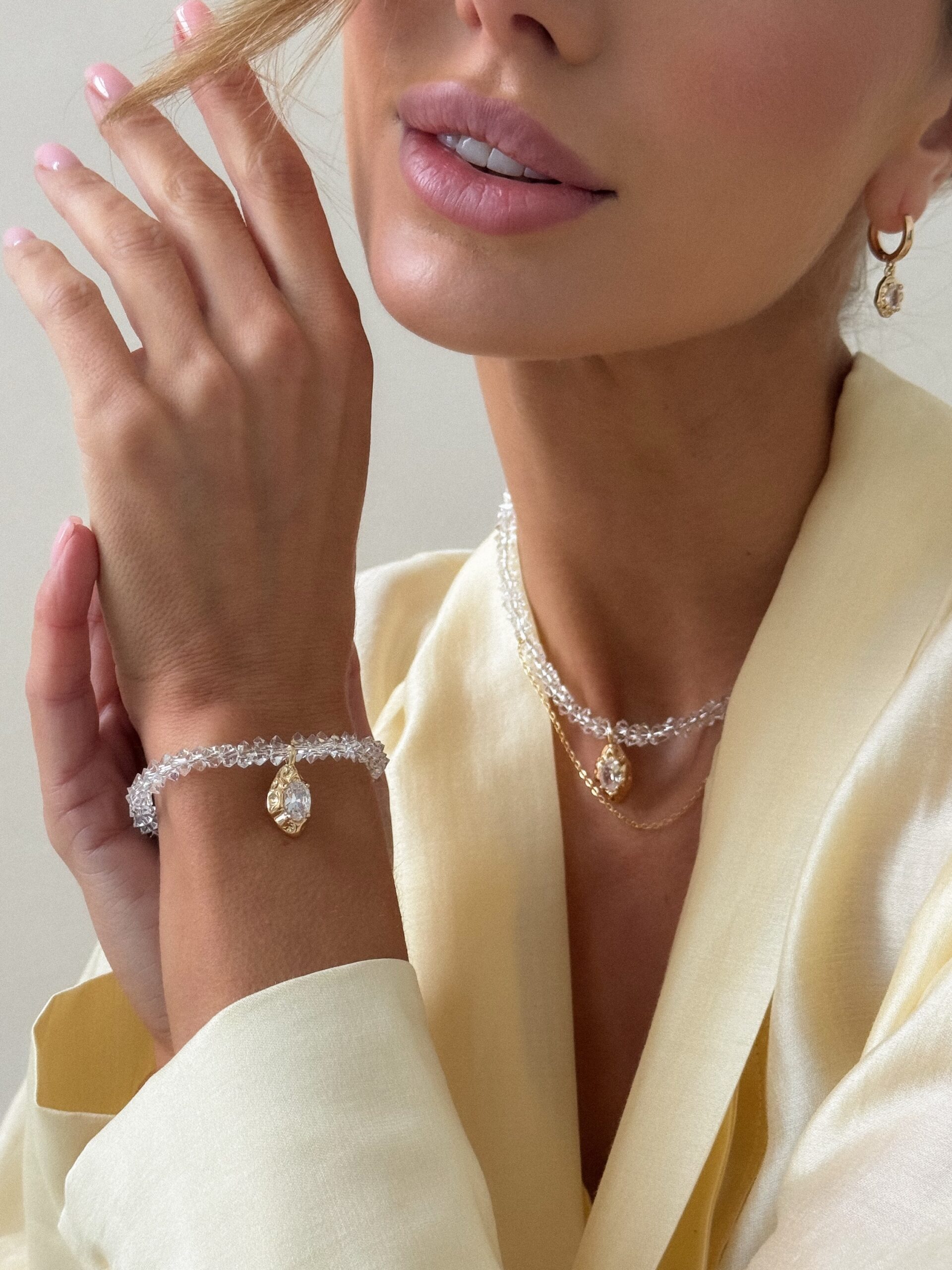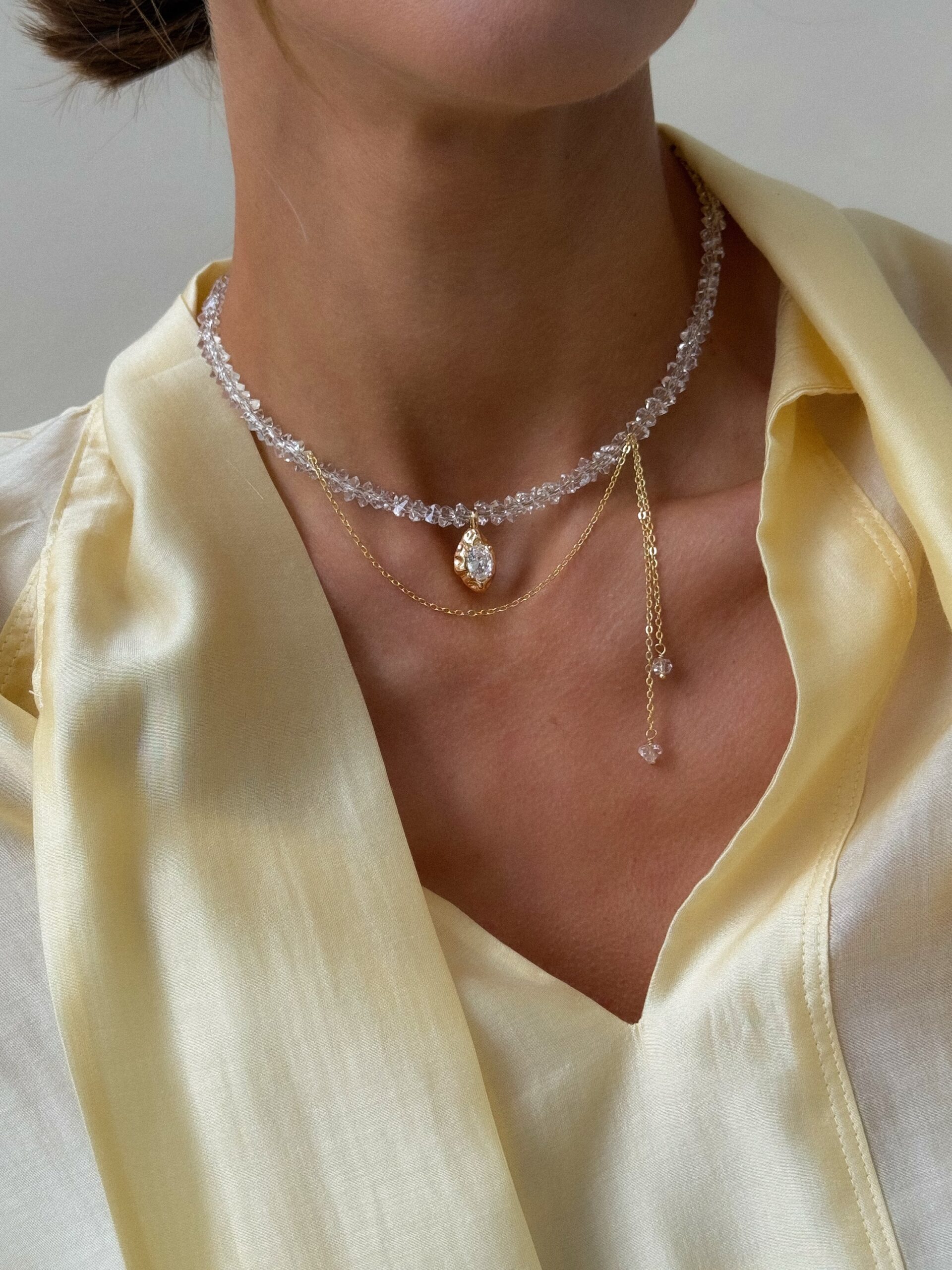 Вишукане кольє з ювелірного кришталю доповнене ніжною підвіскою у золотій оправі створює ефект легкого сяйва на шиї. Прозорі грані кришталю красиво переливаються при кожному русі, додаючи образу елегантності та витонченості. Ідеально пасує як до святкового, так і до щоденного стилю.