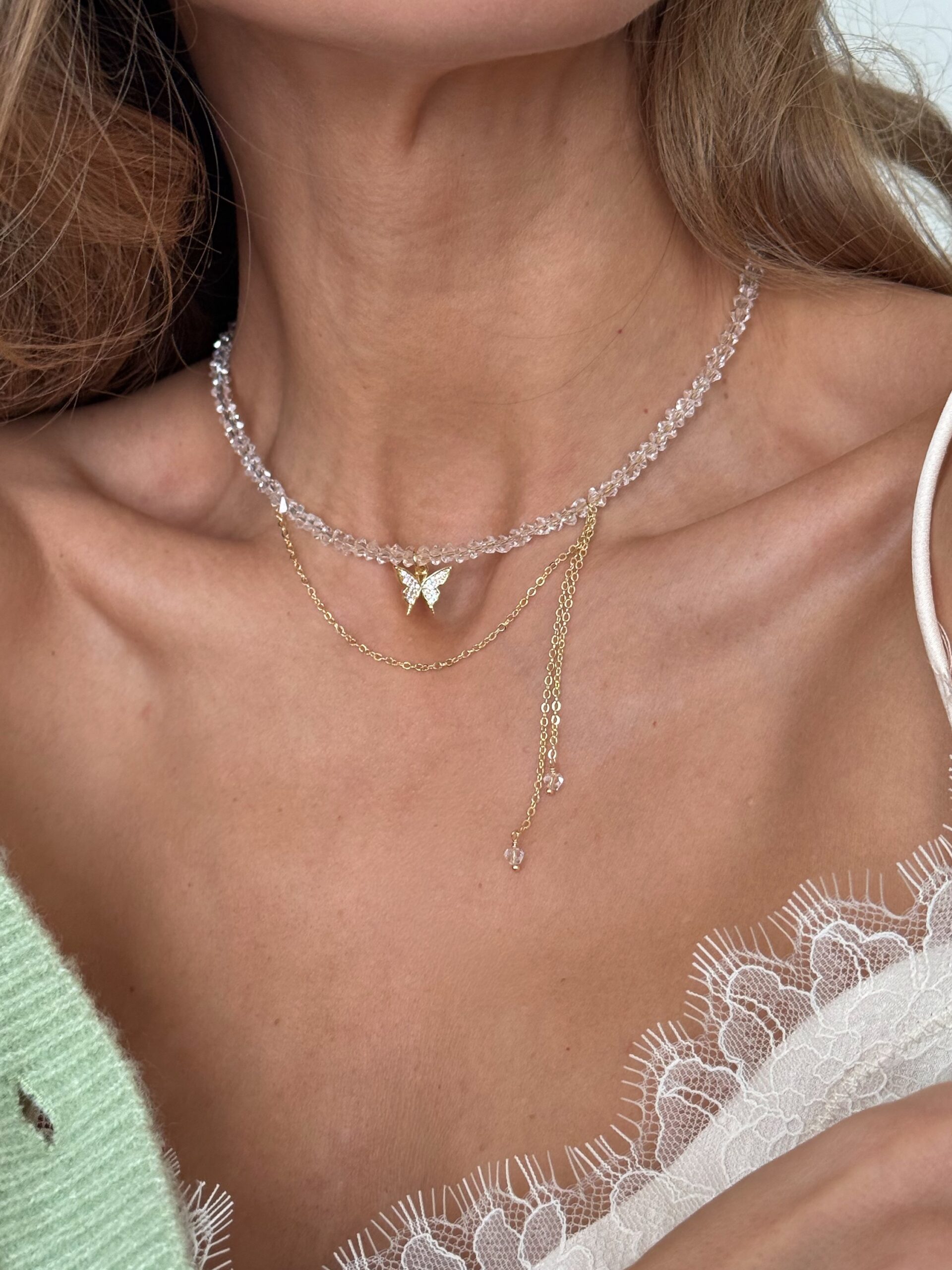 Ніжне кольє з кришталю та тонкого ланцюжка створює ефект легкої невагомості. Акуратні підвіска метелика додає глибини та витонченого акценту, гармонійно поєднуючись з будь-яким вирізом.