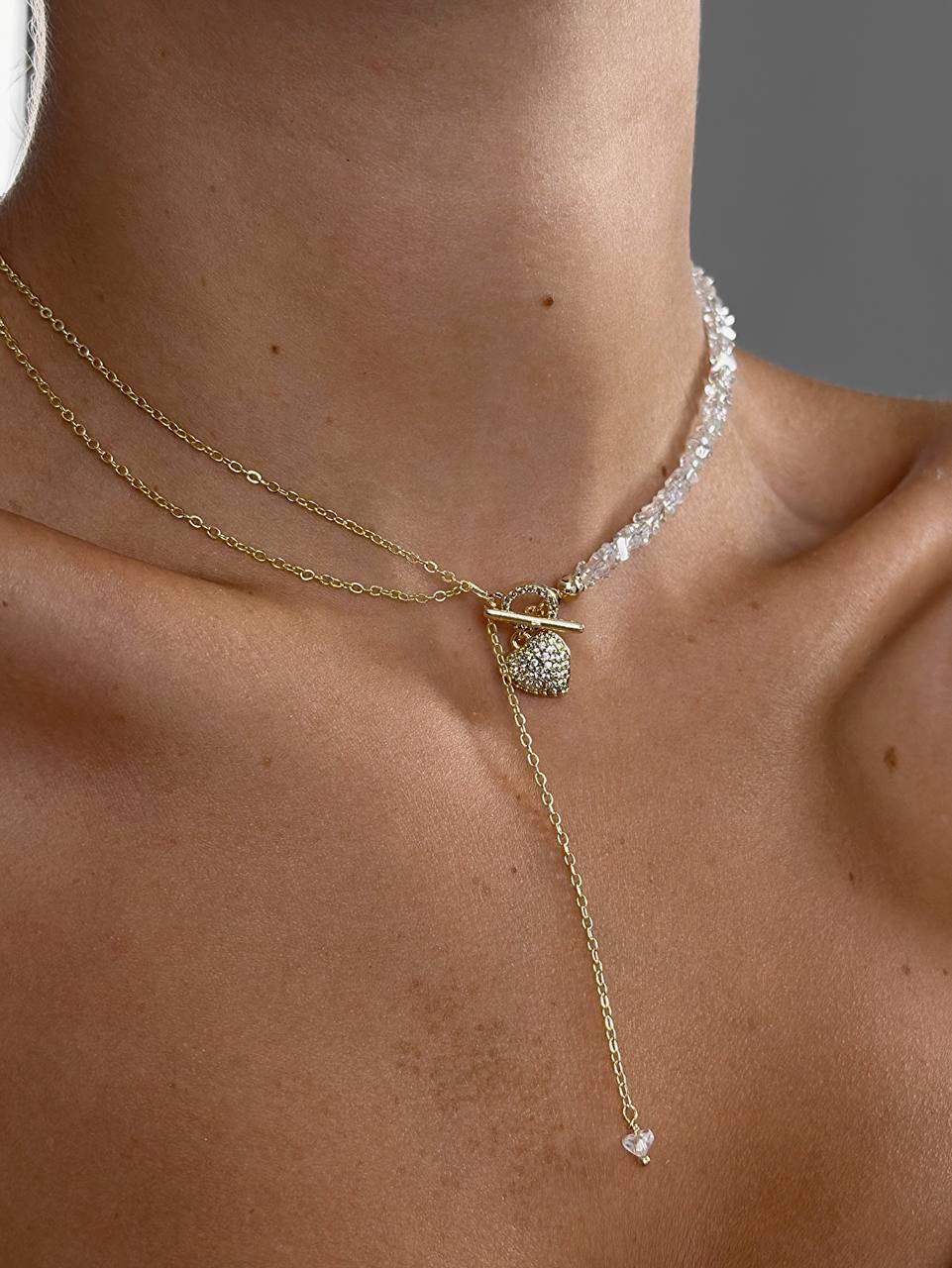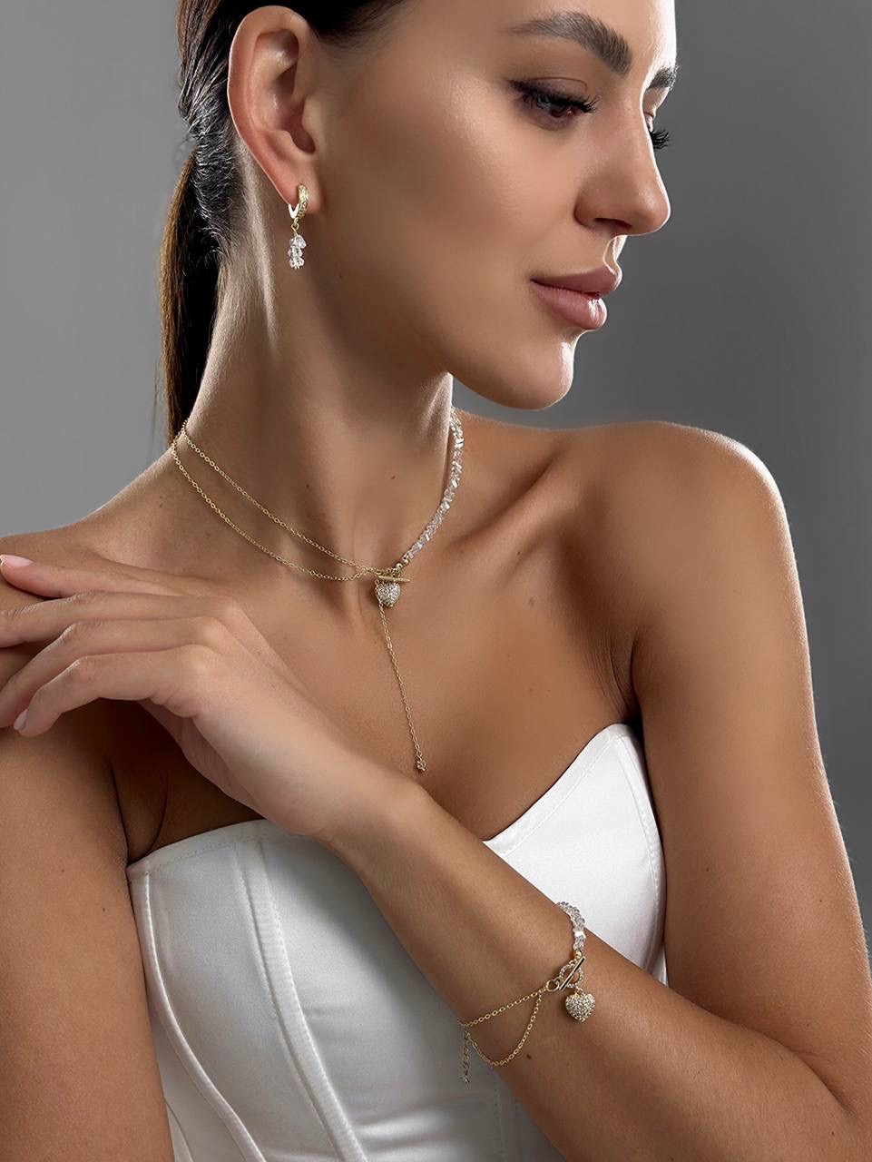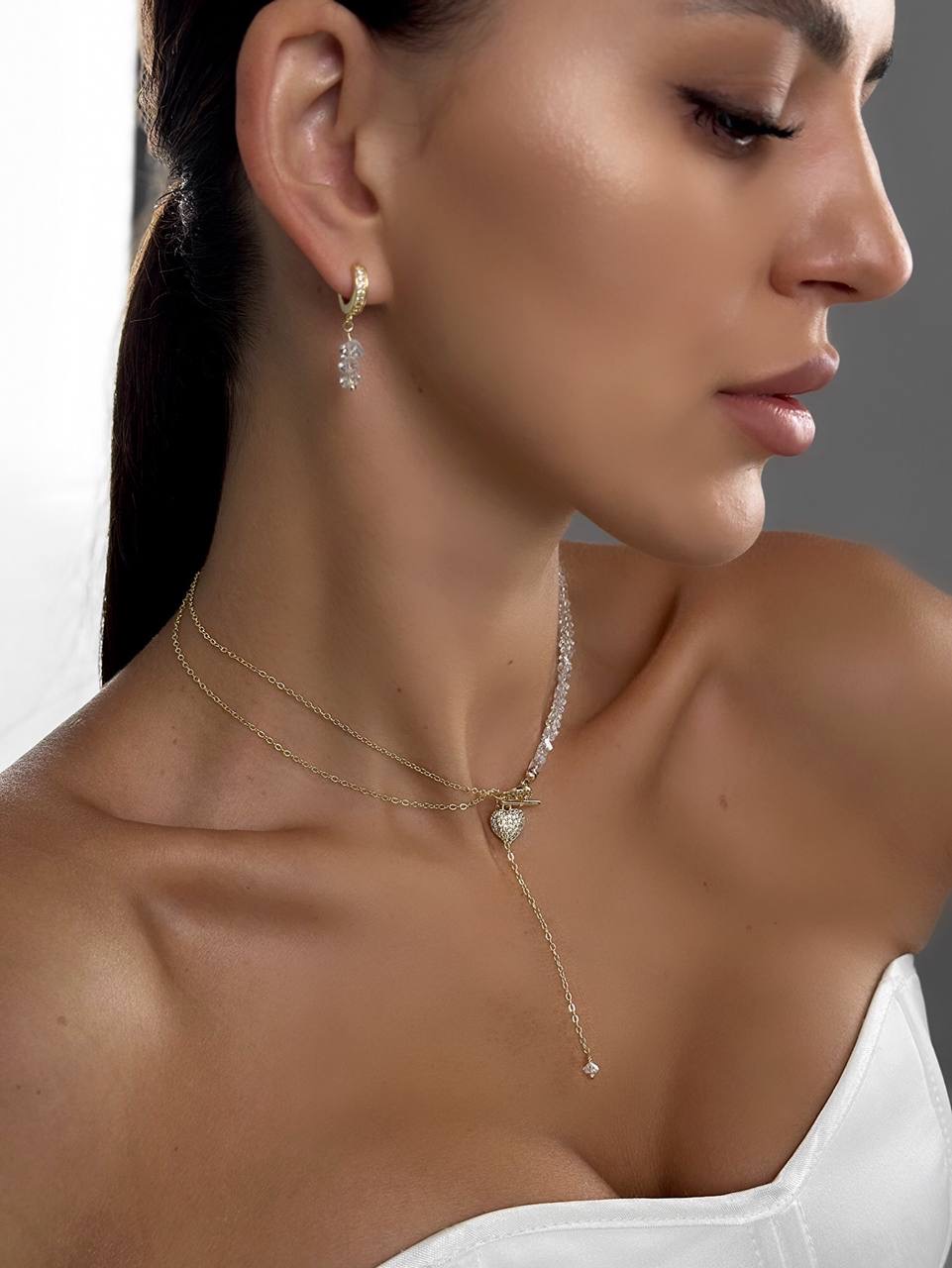 Подвійне кольє з тонких ланцюжків в поєднанні з кришталем.Центральним акцентом є підвіска у формі серця, що символізує кохання та ніжність. Це прикраса, яка гармонійно доповнює романтичний образ і надає йому особливого шарму.