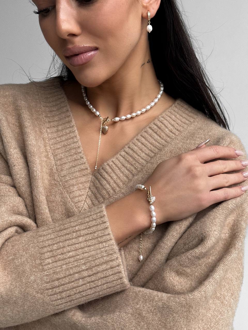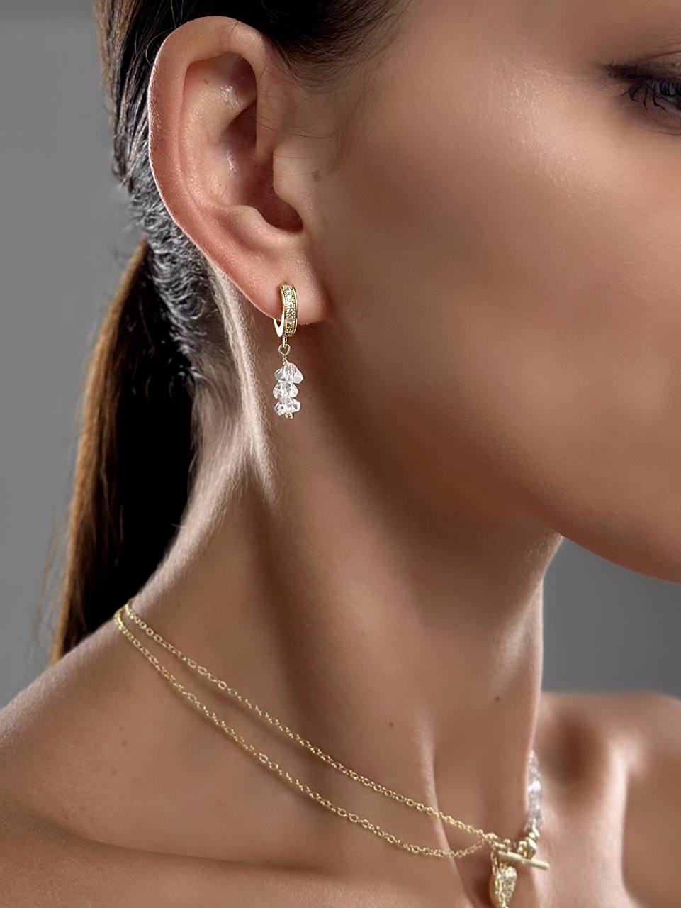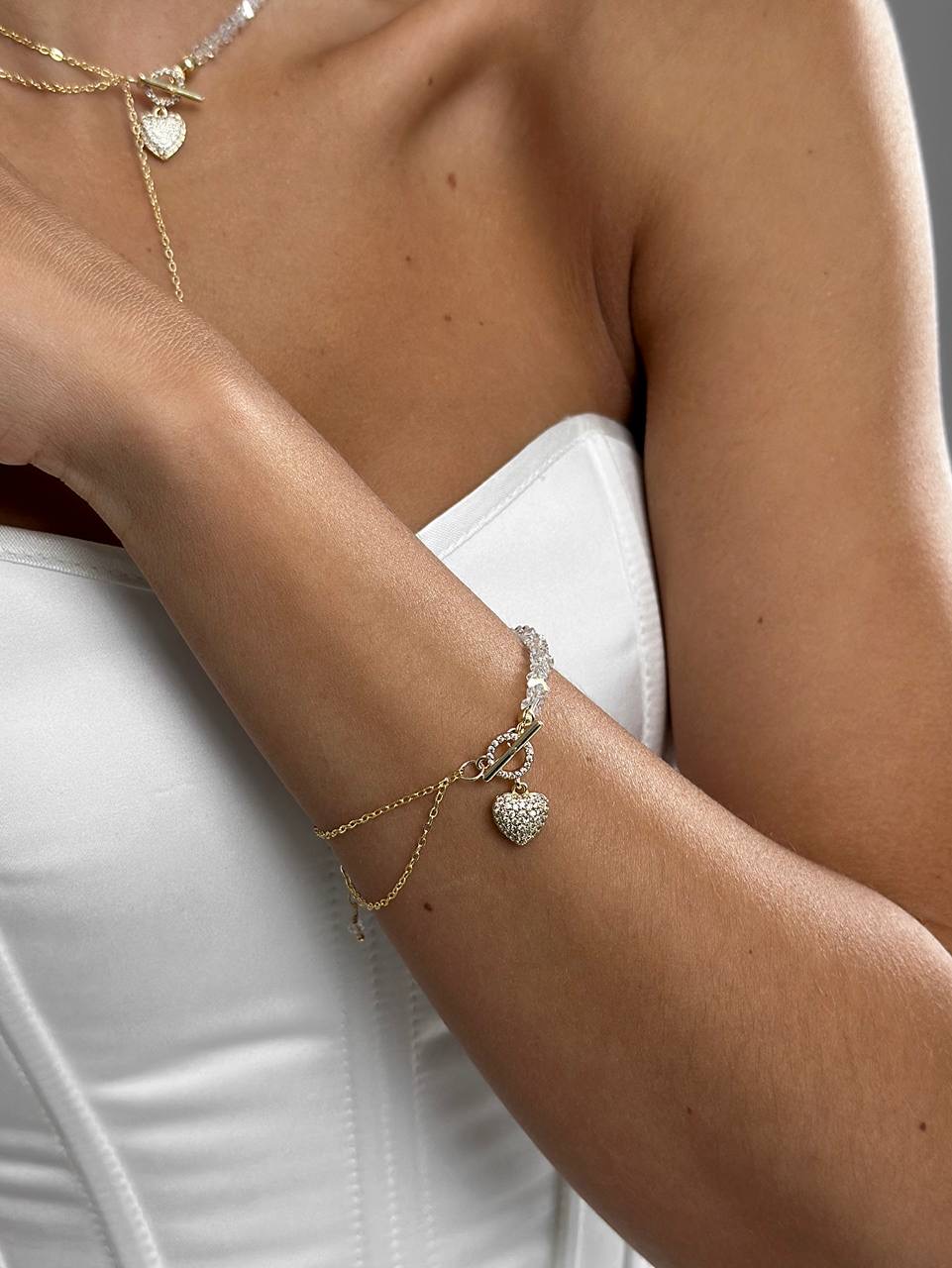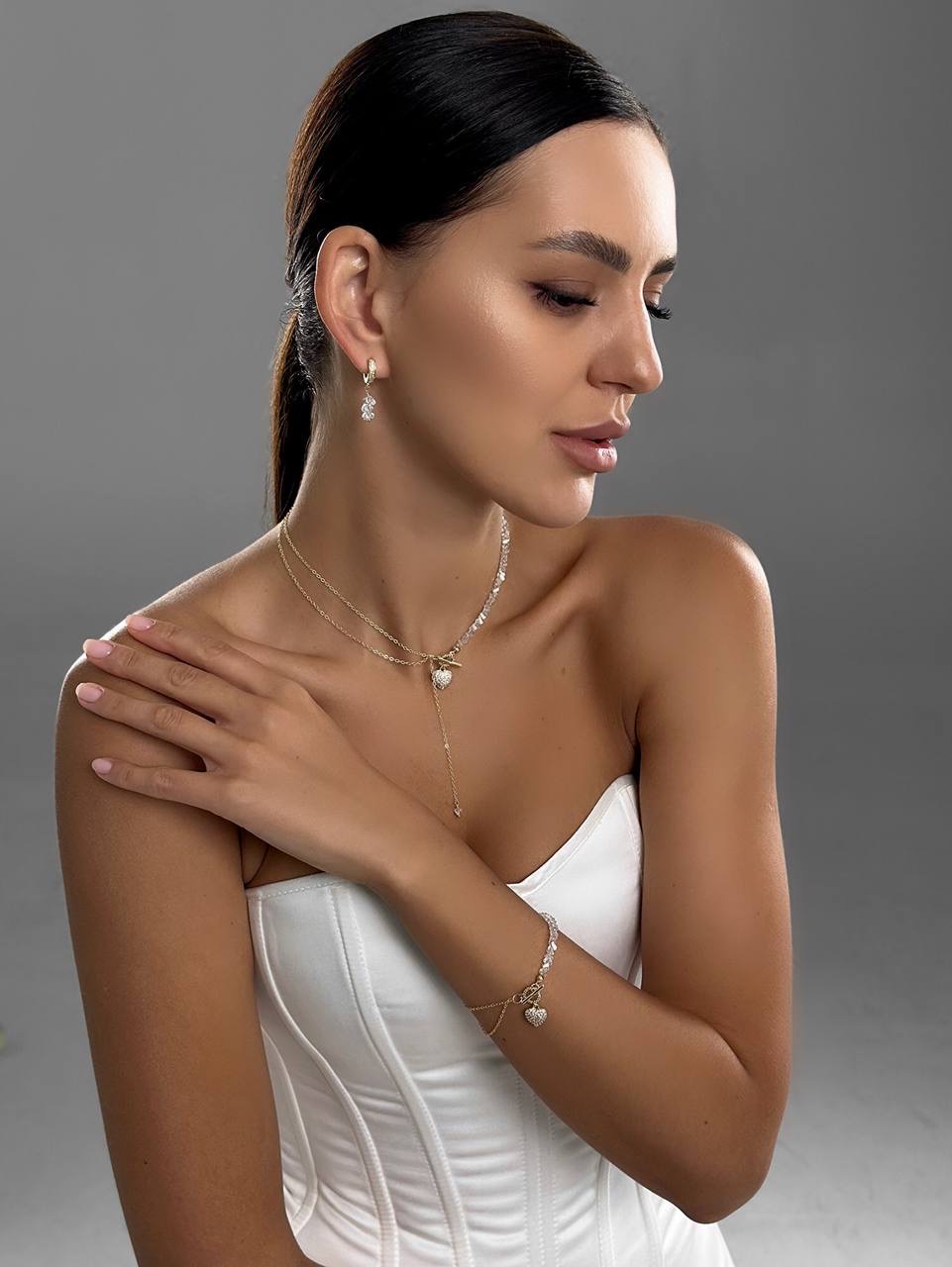Подвійне кольє з тонких ланцюжків в поєднанні з кришталем.Центральним акцентом є підвіска у формі серця, що символізує кохання та ніжність. Це прикраса, яка гармонійно доповнює романтичний образ і надає йому особливого шарму.