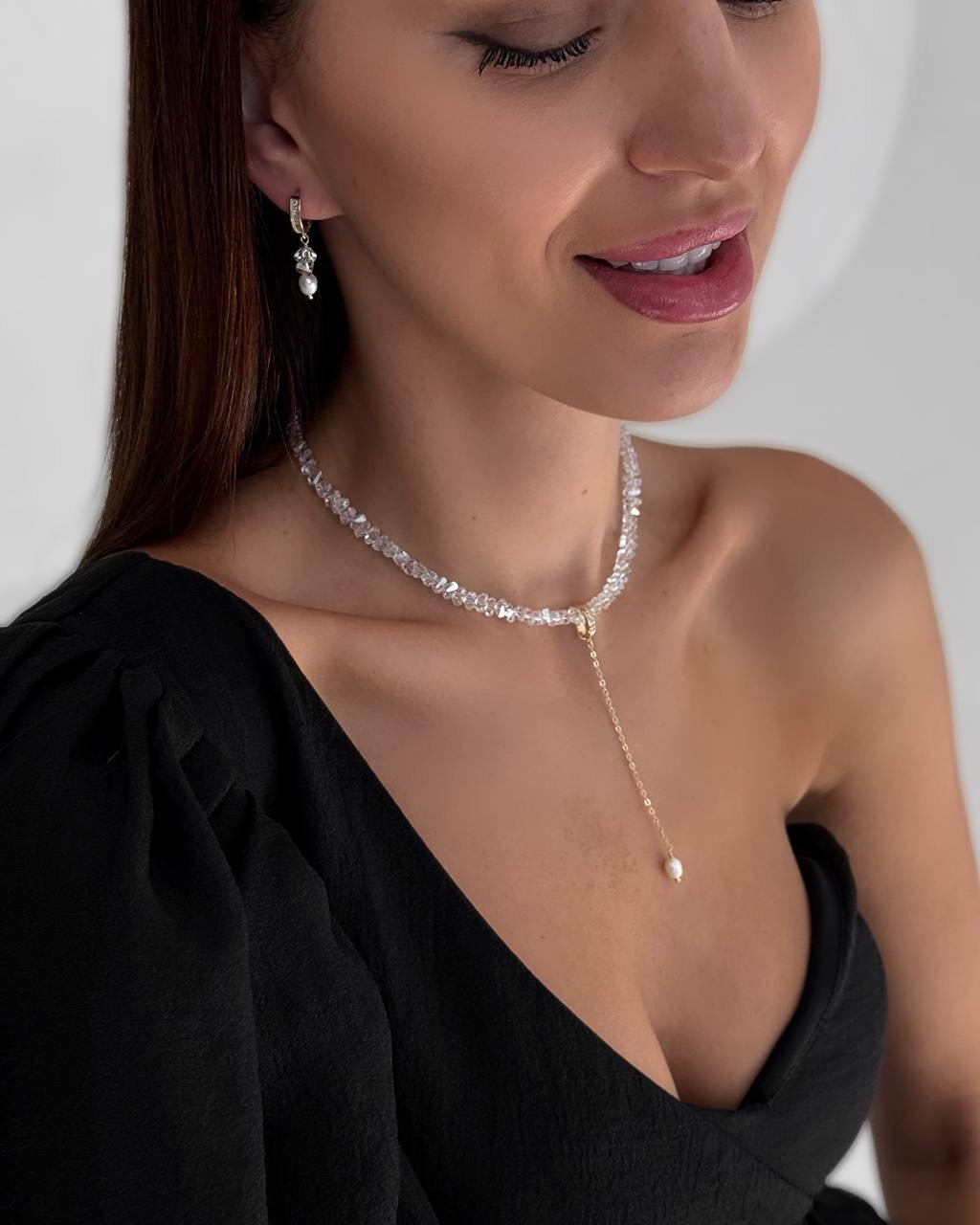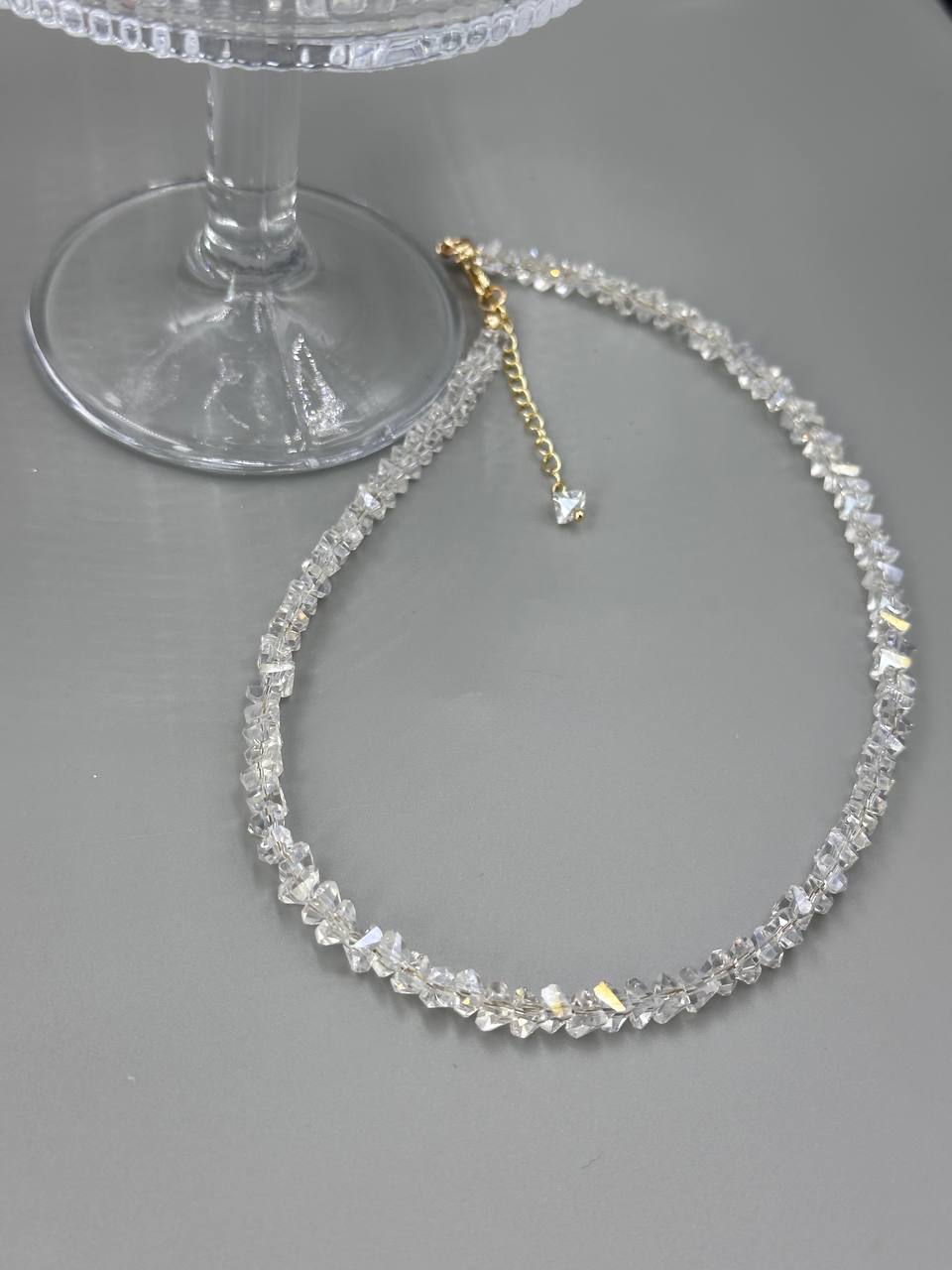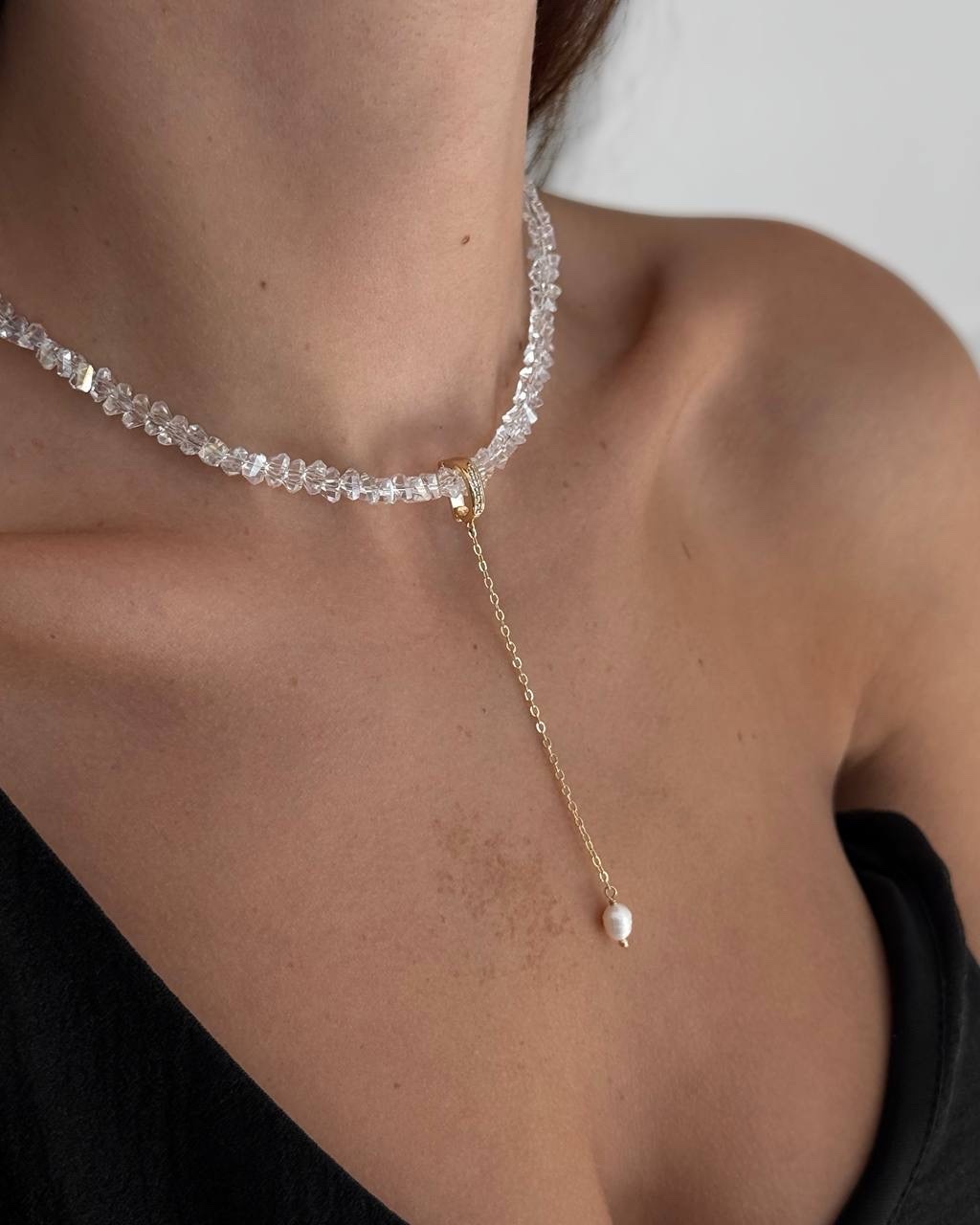 Вишукане кольє з кришталевих намистин, прикрашене золотистою підвіскою з натуральною перлиною. Елегантне поєднання блиску й ніжності створює розкішний акцент, який пасуватиме як до вечірнього образу, так і до романтичного луку.