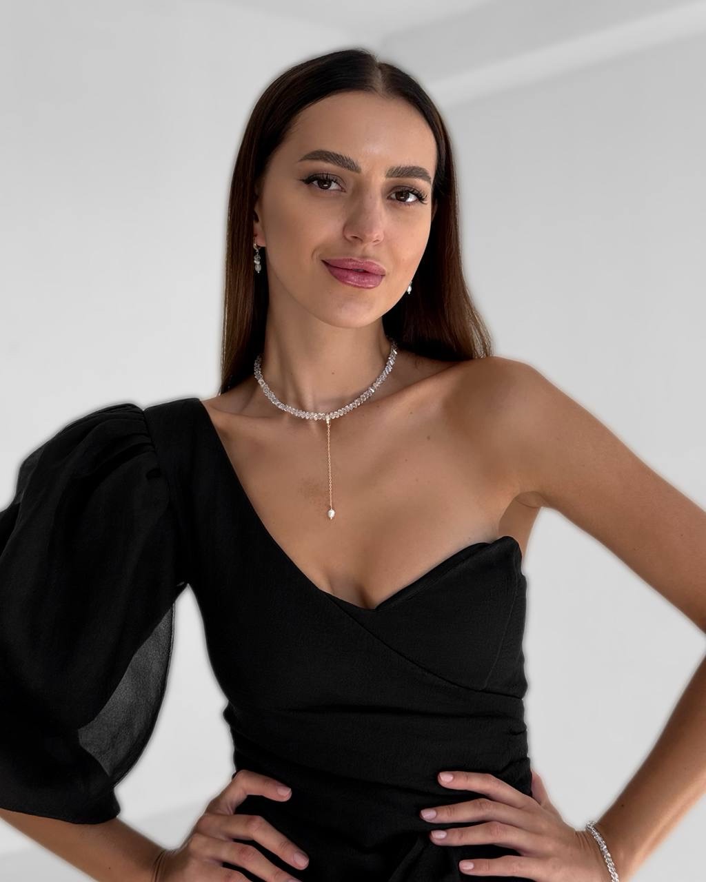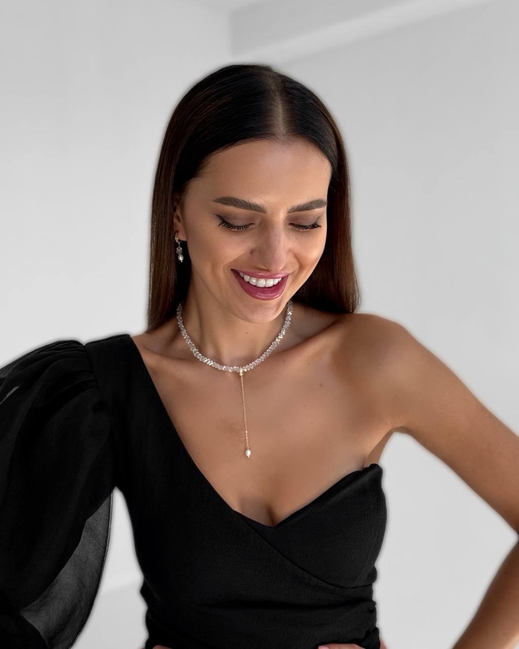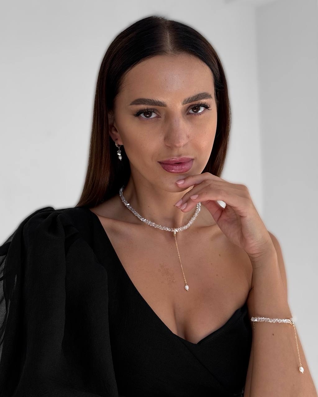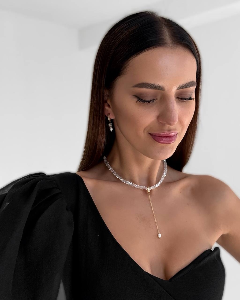 Вишукане кольє з кришталевих намистин, прикрашене золотистою підвіскою з натуральною перлиною. Елегантне поєднання блиску й ніжності створює розкішний акцент, який пасуватиме як до вечірнього образу, так і до романтичного луку.