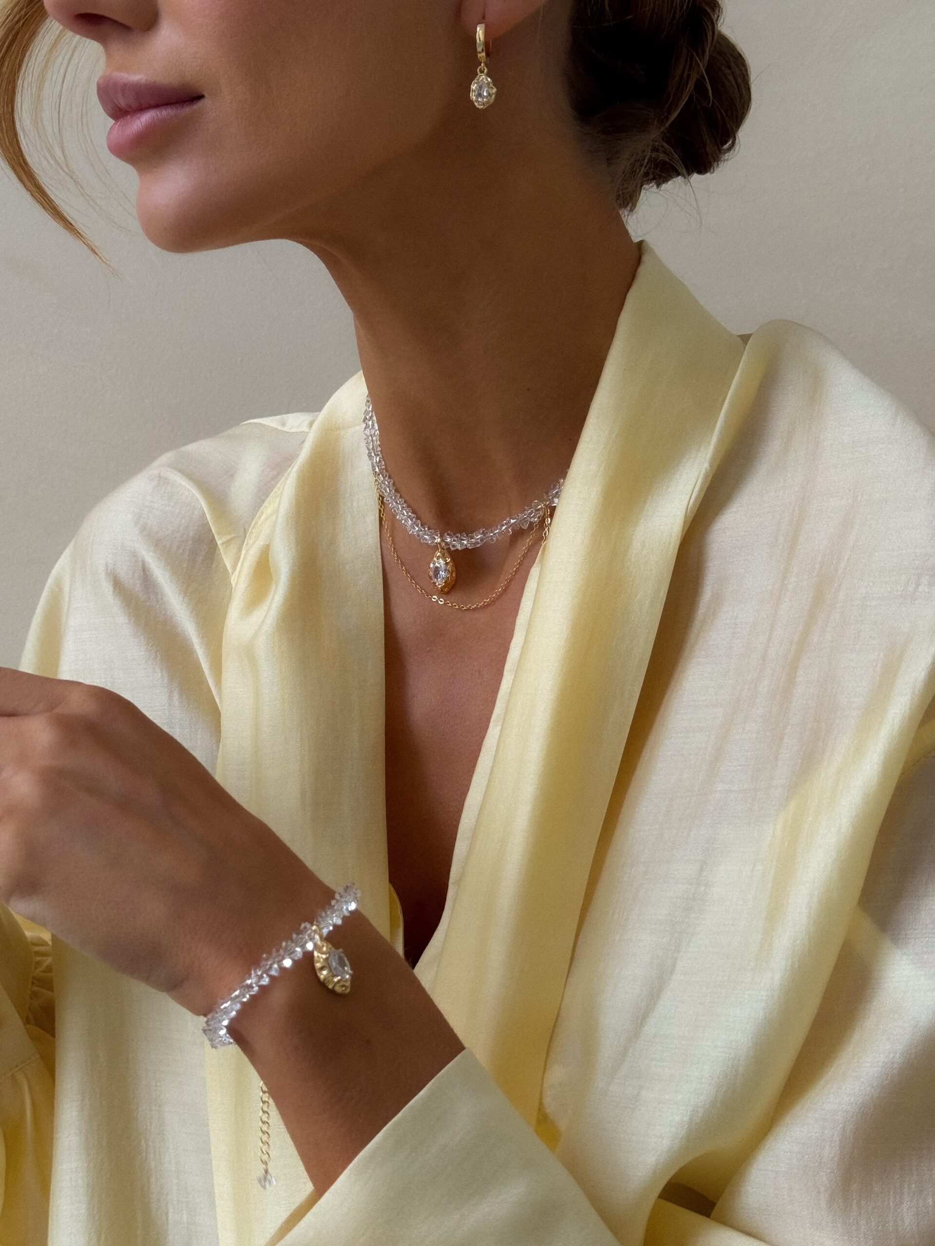 Мінімалістичні сережки з прозорою підвіскою в золотій оправі — ідеальний завершальний штрих до образу. Вони делікатно вловлюють світло та додають мʼякого сяйва, підкреслюючи природну жіночність і витонченість.